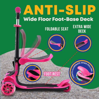 Original price was: $44.99.$35.09Current price is: $35.09.Add to cartColor : Pink Handlebar Height Setting: 705/785/865mm (27.87/31/34.1) Seat height to the ground: 13 Wheel Size Diameter: 120mm x 30 Front, 80mm x 24 Rear Construction Material: Aluminum Metal, Engineered PP Wheel Type / Wheel Material: Engineered Polyurethane Recommended Age: 2 Years and Up Weight Capacity: Up to 110 lbs. (Seat Capacity: 44 lbs.) Foldable Scooter Size (L x W x H): 23.6 x 11.6 x 9.3 Open Scooter Size (L x W x H): 23.6 x 11.6 x 34.1 The fully folding technology of our lightweight childs scooter means you can practically take it anywhere. It can be folded and easily placed in the trunk of your car for days out and vacations. It can also be easily stored in the garage or basement when not in use. There are so many opportunities where your child can enjoy the freedom of scooting as well without a heavy, bulky scooter weighing you all down. A great gift Perfect for toddlers and young children from 2 years of age. Our scooter offers a standing and sitting option which is comfortable and practical when at the park, out with friends, playing in the backyard and on vacation! Whether you want to treat your son, daughter, grandchild or family friend to a special gift, this is a must have scooter thanks to the superior folding technology, flashing LED wheels and added comfort of a folding seat!