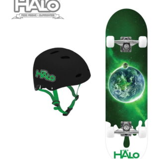 Original price was: $47.69.$39.58Current price is: $39.58.Add to cartHalo Rise Above Pro Skateboard + Helmet Combo Set! Premium Wood, Double Kick Tail Skateboard with awesome Green Planet and drip graphics, Long lasting polymer wheels with high precision bearings and heavy duty aluminum trucks and base. HALO Multi-Sport Helmet with size adjustable head ring, Black Shell, Green Strap and Graphic Logo. HALO Clear Triangle display packaging with color logos matching the product inside!