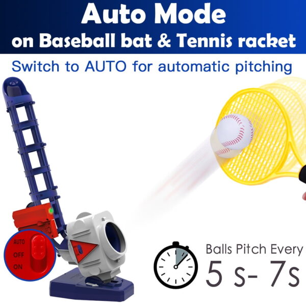 2-IN-1 Pitching Machine – Works for Baseball and Tennis. Set consists of a pitching machine, baseball bat, tennis racket and 6 PP balls. Batteries not included.
