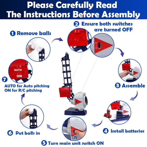 RC and Auto Modes. This upgraded version of the original iPlay, iLearn pitching machine adds the addition of an RC (remote control) baseball bat. Switch device to ON for RC pitching, press red button on the bat to trigger a pitch. Note: Tennis racket is only available in auto mode. Balls pitch every 5S-7S in Auto mode. Over Load Protection – Self-regulating jam protection built into the device. If unresponsive or jammed, turn off the machine, remove balls and wait 5-10 minutes before turning the machine back on. The device will reset and work properly. Give the Perfect Sports Gift – Constant repetition is the most important step to becoming an expert! Automated pitching machine makes repetition and batting practice easy.