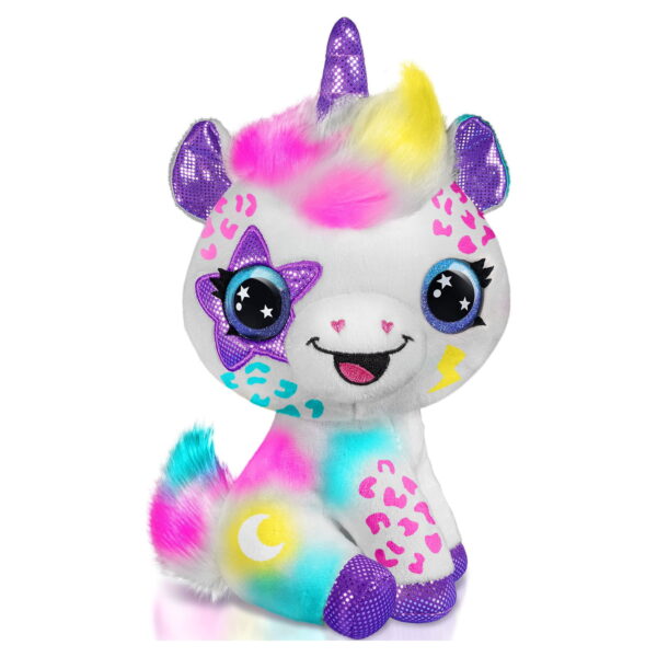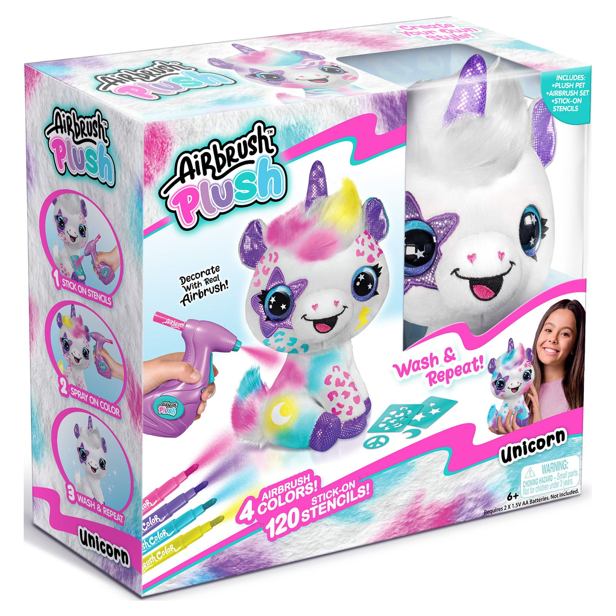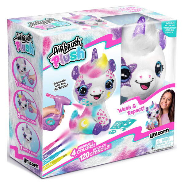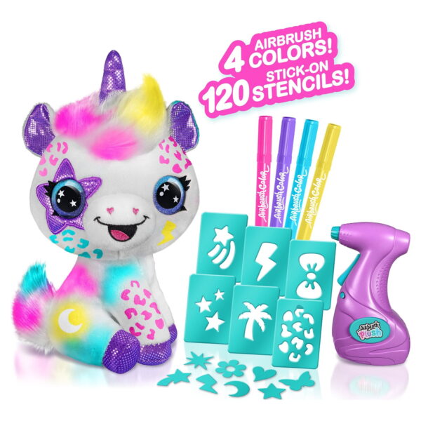 Customize your own adorable and soft plush unicorn! Design and create your own multicolored plush with the battery-powered airbrush gun and stick-on stencils. The real airbrush gun makes it so easy and satisfying to create trendy and cute multicolored plushies! Use the airbrush gun to apply your favorite colors and create cool, seamless, color-blended effects! This super cute plush is your blank canvas. Explore your personal style and creativity by customizing over and over again! When youre ready for a new design, simply wash off the old one and start over! This collectible plush looks brand new even after being washed, so the possibilities are endless. Redesign and update your plush with trendy and fun themes as your mood & style changes!
