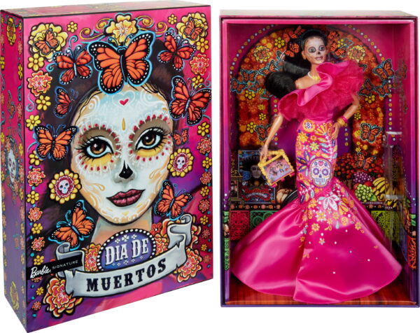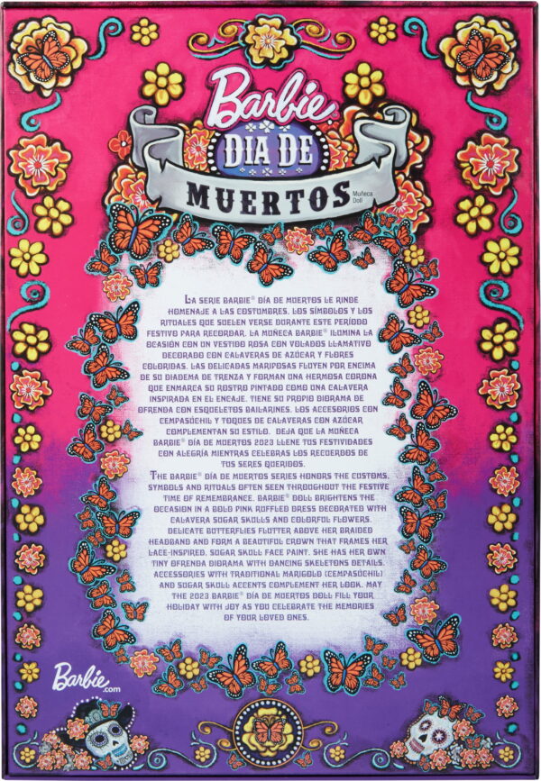 Celebrate Da De Muertos 2023 with a collectible Barbie doll! She wears a gorgeous gown that pays homage to the traditions, symbols and rituals of this time-honored holiday Barbie doll brightens the occasion in a satiny pink dress adorned with colorful sugar skulls and flowers. A boldly ruffled neckline and flared hem make the silhouette all the more stunning Delicate butterflies flutter above her braided headband and form a beautiful crown that frames her lace-inspired calavera face paint She comes with her own miniature ofrenda diorama with dancing skeletons inside! Accessories detailed by traditional marigold (cempaschil) and sugar skull accents complement her look The 2023 Barbie Da De Muertos doll comes in deluxe packaging and is perfect for display and gifting. May she fill your holiday with joy as you celebrate the memories of loved ones!
