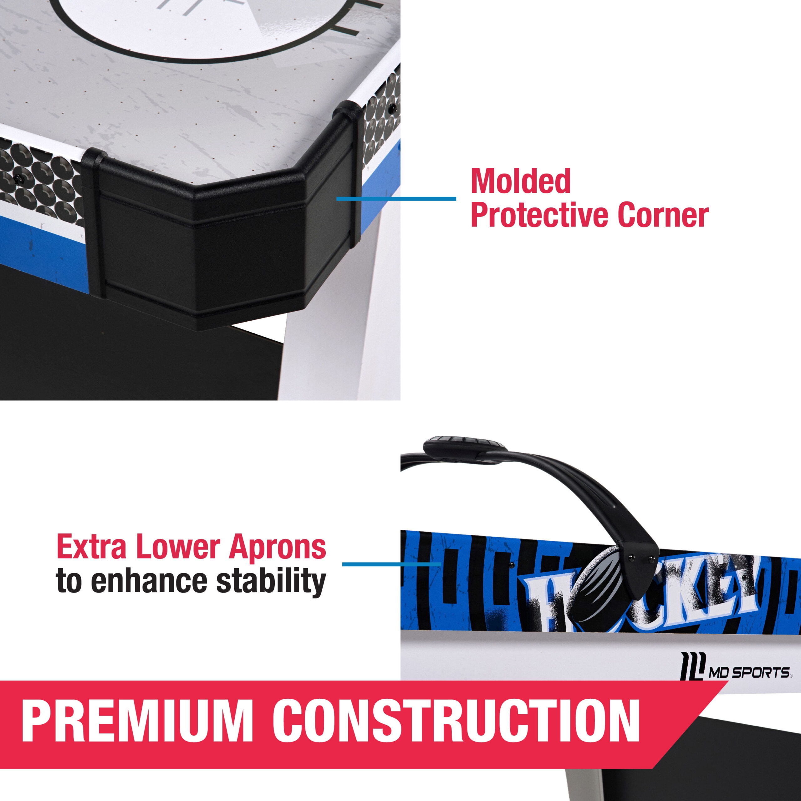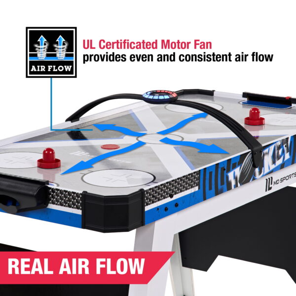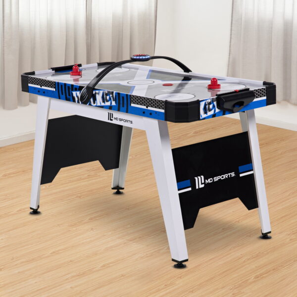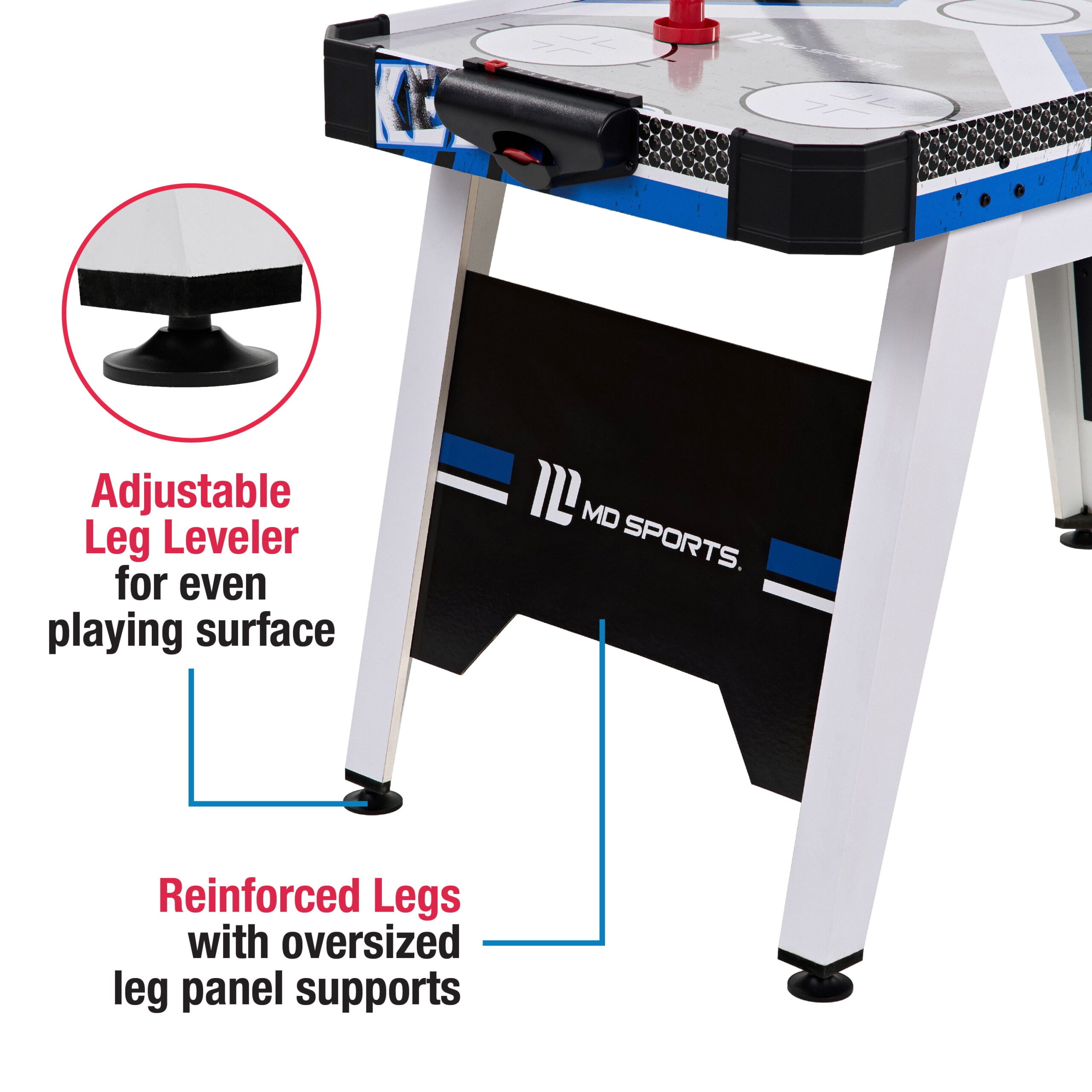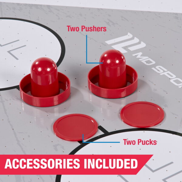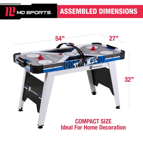 MD Sports Air Hockey Table Set, Overhead Electronic Scorer, 2 Pushers, 2 Pucks, by MD Sports Assembled Dimensions: 54 inch x 27 inch x 32 inch Play Surface Dimensions: 53 inch x 26 inch High-Gloss Smooth Playfield The specially coated surface enhances puck speed and increases durability 4-molded protective corners Solid MDF construction material Lower leg aprons and slanted legs with full leg panel supports provide enhanced stability Adjustable leg levelers for an even playing surface Overhead Electronic Scorer Digital overhead scoring display of the score and game time Supported with molded plastic arms Includes 2-manual slide scorers Consistent Air Flow for Fast Puck Action 12-volt DC UL-certified motor provides strong and consistent airflow Accessories: Includes 2 pushers and 2 pucks Assembled Product Weight: 36.3 lbs. Package Weight: 52.6 lbs. Package Dimensions: 58.00″ x 31.13″ x 4.87″ Age Group: Perfect for teens and adults ages 13 and up New condition