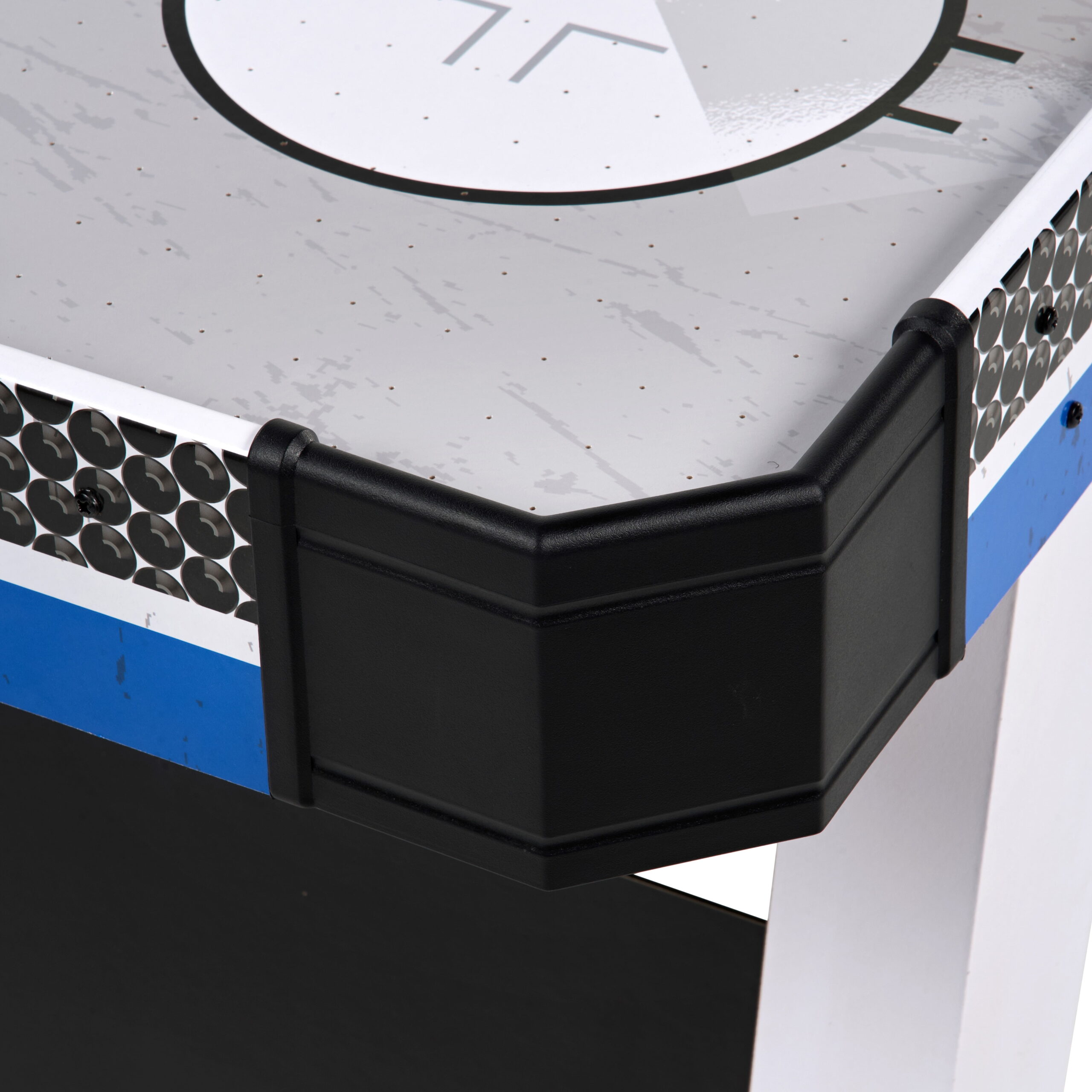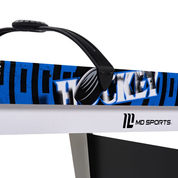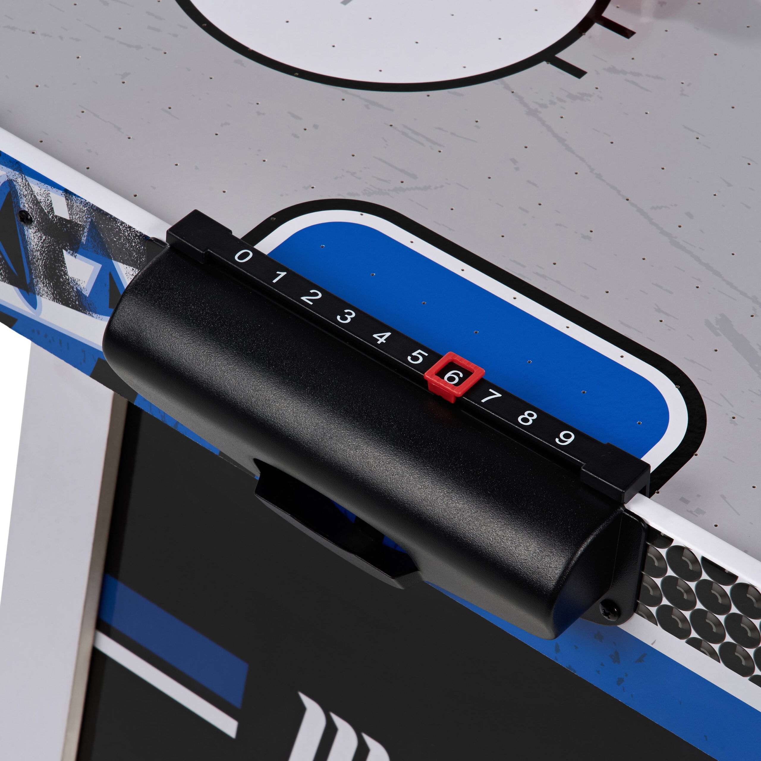 MD Sports Air Hockey Table Set, Overhead Electronic Scorer, 2 Pushers, 2 Pucks, by MD Sports Assembled Dimensions: 54 inch x 27 inch x 32 inch Play Surface Dimensions: 53 inch x 26 inch High-Gloss Smooth Playfield The specially coated surface enhances puck speed and increases durability 4-molded protective corners Solid MDF construction material Lower leg aprons and slanted legs with full leg panel supports provide enhanced stability Adjustable leg levelers for an even playing surface Overhead Electronic Scorer Digital overhead scoring display of the score and game time Supported with molded plastic arms Includes 2-manual slide scorers Consistent Air Flow for Fast Puck Action 12-volt DC UL-certified motor provides strong and consistent airflow Accessories: Includes 2 pushers and 2 pucks Assembled Product Weight: 36.3 lbs. Package Weight: 52.6 lbs. Package Dimensions: 58.00″ x 31.13″ x 4.87″ Age Group: Perfect for teens and adults ages 13 and up New condition