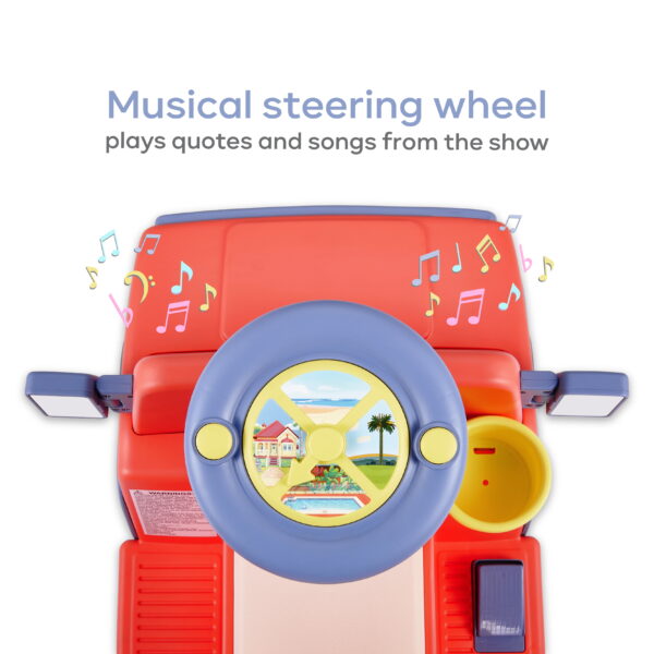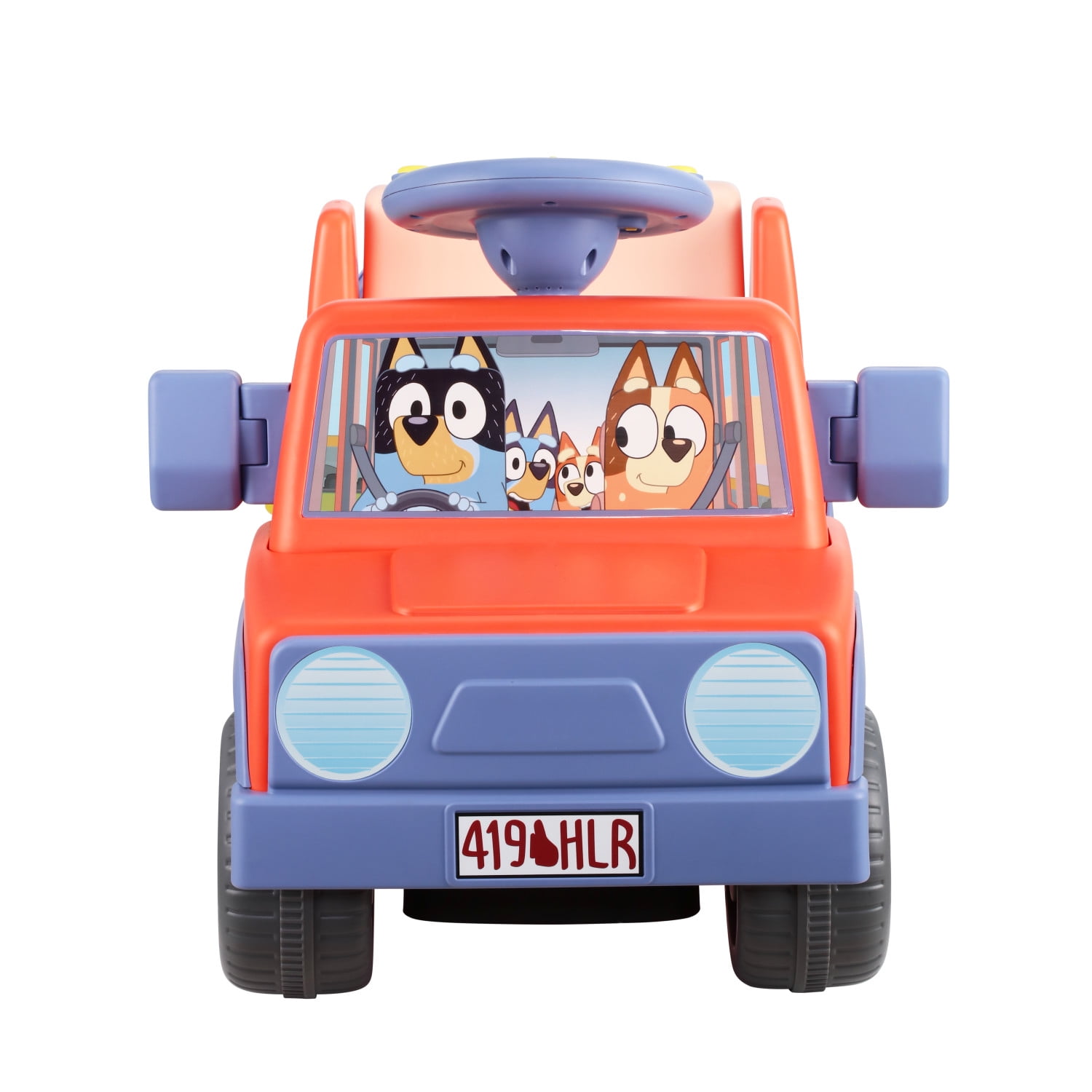 Bluey 6 Volt Powered Ride on Car with Sounds Steering wheel plays quotes and songs from the show Adjustable and reflective side mirrors Rechargeable 6 volt battery Spare tire storage case and cup holder pounds Fits one rider up to 55 lbs. For Unisex Kids and Toddlers Ages 2+