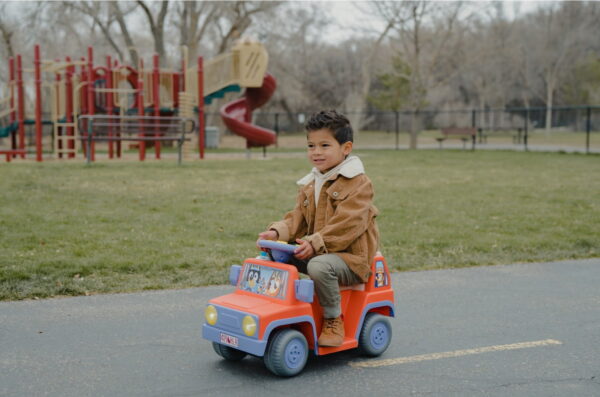 Go on a fun family adventure with the Bluey Ride-On Car! Your toddler gets to join Bluey and Bingo for countless hours of driveway fun on this ride-on jeep designed for children between 24 and 48 months old. The steering wheel plays songs and quotes from the show, including the Bluey Theme and Here Comes the Grannies songs. You can place water or juice in the cup holder, put your favorite toys in the spare tire storage case, and use the adjustable and reflective side mirrors for added realism. Simply plug in the 6 volt battery with the included charger to be ready to play in no time. The Bluey Ride-On Car fits one rider with a 55 pound weight limit and is the perfect toy for boys or girls.