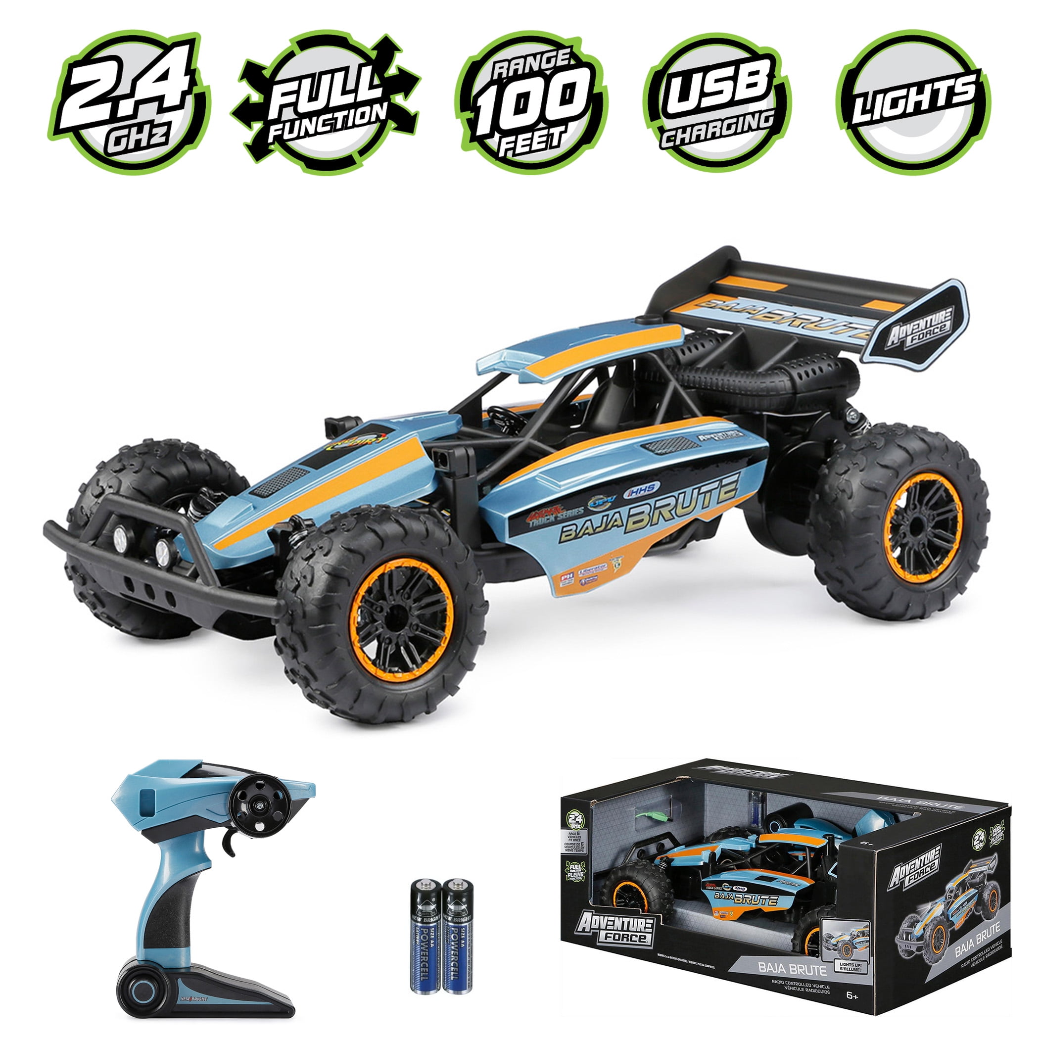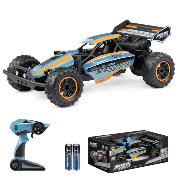 Power through any maze of dust and dirt with the super powered, supersized 1:8 Scale Radio Control Baja Brute Buggy from Adventure Force. With improved speed and handling, this Brute is as cool as its Ice Blue color. Bright LED headlights help you see and be seen in low light situations. 2.4GHz wireless radio technology allows up to six vehicles to run on the same frequency without signal crossing plus a 100 foot range of operation. Pistol grip remote controller offers precise control. The Baja Brute recharges by USB – simply plug the attached cord into any powered USB outlet and in two hours it’s ready for more action. Ready to Run, all required batteries included. The Baja Brute Buggy is recommended for children ages six and up.
