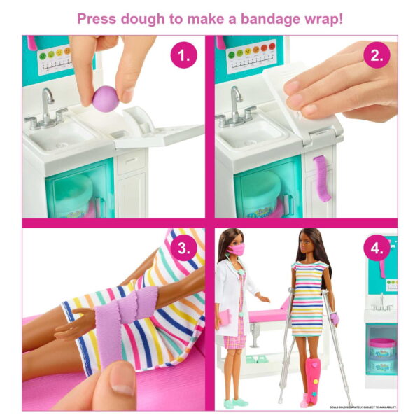 Explore a world of caretaking fun with the Barbie Fast Cast Clinic playset! When girls play with Barbie, they imagine everything they can become, and for those that love taking care of others, they can run a Fast Cast Clinic! The clinic includes a brunette Barbie doctor doll (12-in/30.40-cm) and 4 play areas: a medical station, exam table, X-ray machine and gift shop. Kids can make casts for their doll ‘patient’ (sold separately) with a realistic cast making feature (use pink, purple or white dough) to create casts for the patient’s arms and legs and create wraps with the bandage maker. Playset also includes 30+ pieces to play out the fun: 3 dough containers, leg cast, Chelsea arm cast, a set of crutches, stickers, X-rays, gift shop items and more. Some of the accessories feature a clip so Barbie doctor doll can hold them for even more realistic play! Kids will love the endless possibilities for creative expression and storytelling fun! Doll cannot stand alone. Colors and decorations may vary. Makes a great gift for ages 3 and up.