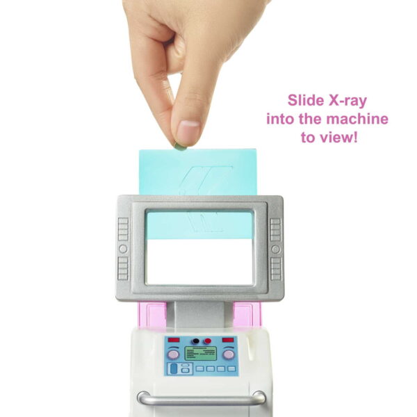 Explore a world of taking care of others with the Barbie Fast Cast Clinic playset! Wearing a cute plaid dress, white doctor’s coat and sporting a stethoscope and clipboard, Barbie doctor doll (12-in/30.40-cm) is ready to take care of patients. Barbie doctor doll can prepare at her medical station, take X-rays and check patients on the exam table. When she determines a patient has a broken arm or leg, she can make a pink, purple or white cast with the dough and cast-making accessories! There are also stickers to decorate the patient’s cast. Barbie doctor doll can also use dough in the bandage-making station to create a wrap for her patient injuries as well! When it’s time for a break, visit the colorful gift shop to get a gift or snack!