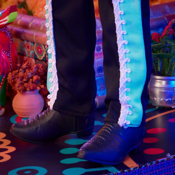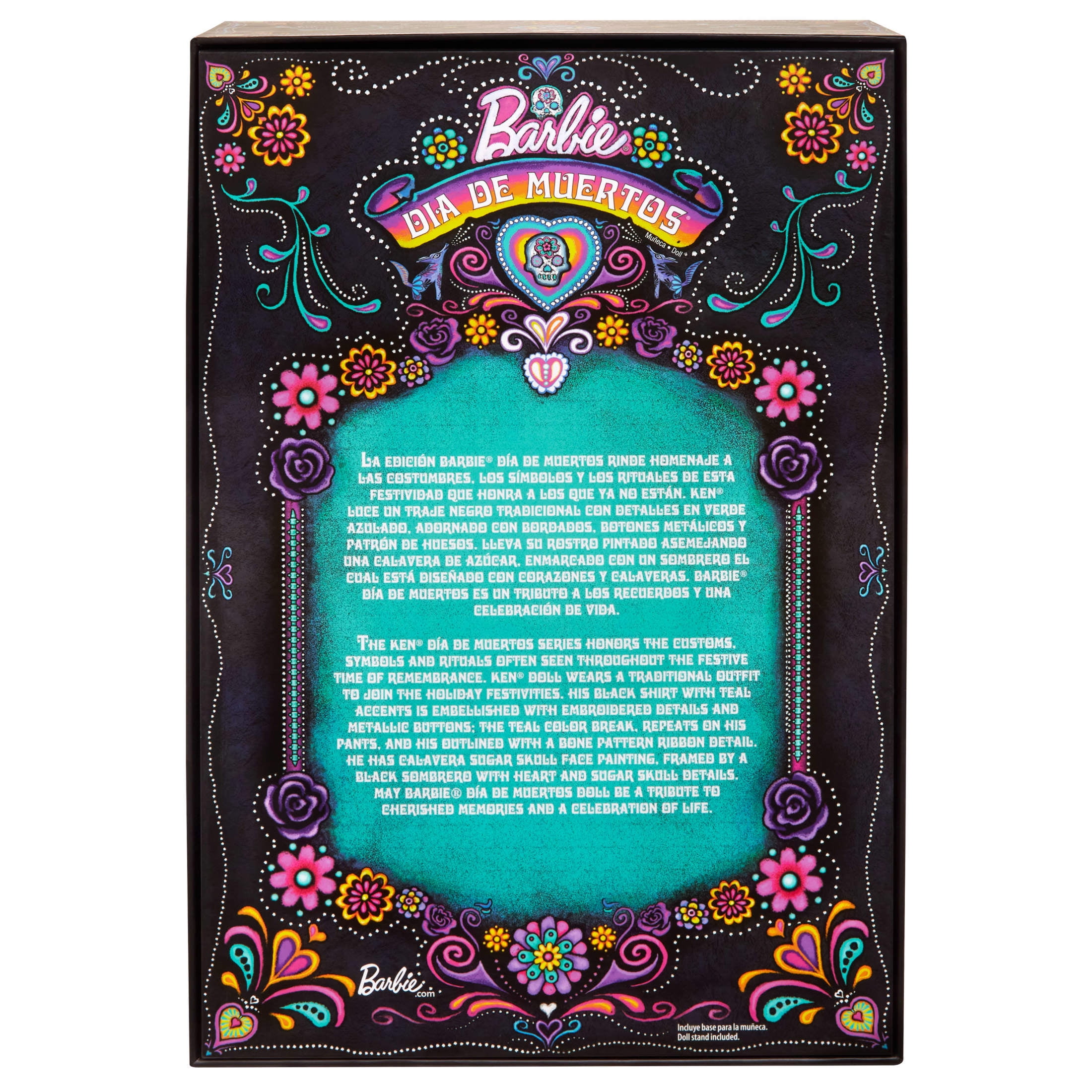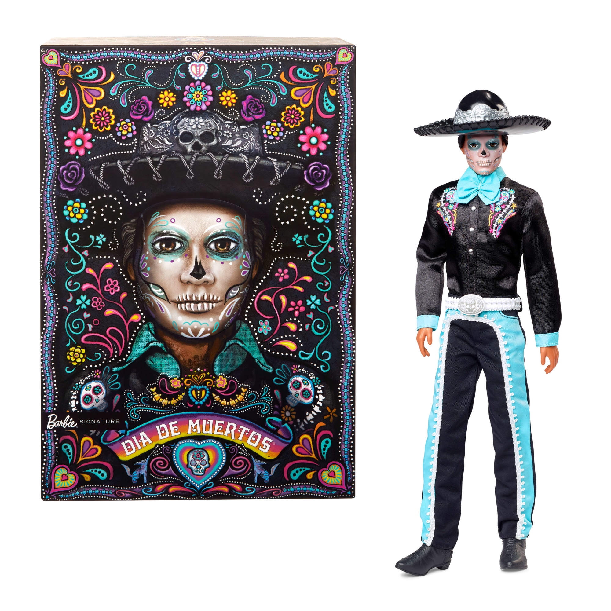 Barbie continues its Da De Muertos series in 2024 with a sophisticated Ken doll. He wears a deluxe suit infused with references to the traditions, symbols, and rituals of this time-honored holiday. Ken doll’s satiny black look features sky blue accent fabric at the collar, cuffs, and pants. White ribbon trim along the pants elegantly mimics bone. Vibrant ’embroidery’ of flowers, bones, and sugar skulls adds an additional splash of color to his tailored button down. A glossy black sombrero accentuates his blue-toned calavera face paint, while a sugar skull belt and matching shoes complement his festive look. The 2024 Barbie Da De Muertos doll comes in gorgeously illustrated packaging that is perfect for display and gifting. May he bring joy to your household as you celebrate the memories of loved ones!