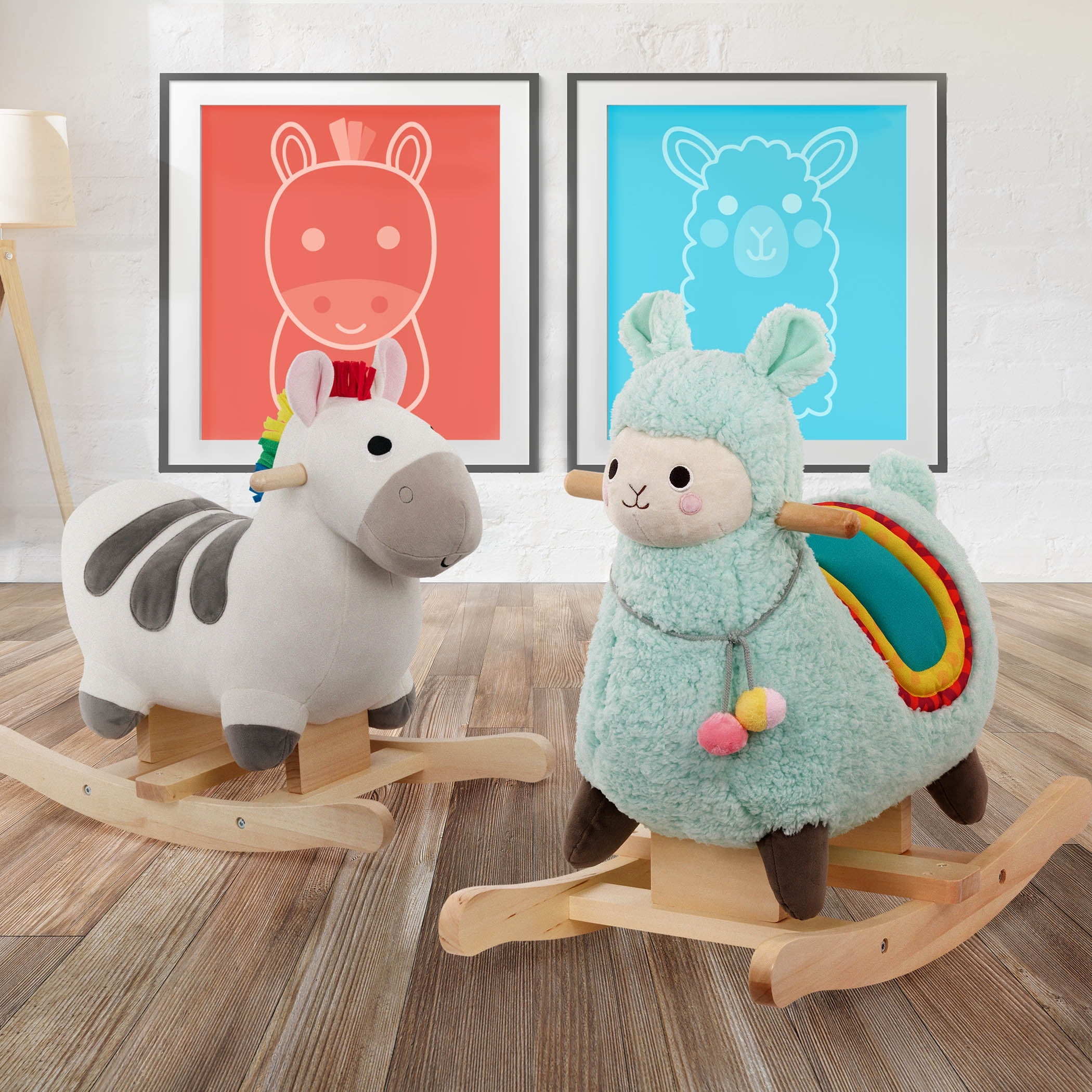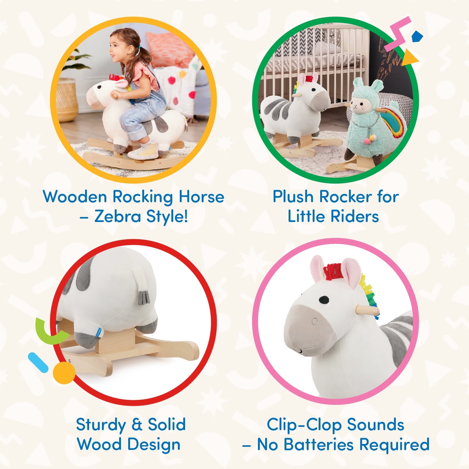 Saddle up and take a ride this plush zebra unisex rocker is a fun twist on a playroom classic Zebra is soft and squishy, with smooth wooden handles for a comfortable ride Listen to clip-clop sounds as you rock back and forth no batteries required Improves balance, develops gross motor skills, and keeps kids active The Battat Rockin’ Zebra is recommended for toddlers 12 months and over