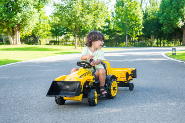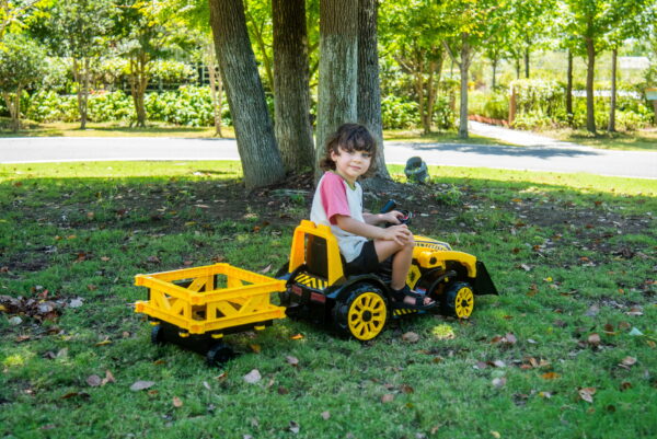 Get ready for big building fun with the Tonka 6V Construction Tractor Ride-On. Kids can drive forward and reverse using easy push-button controls. A working front loader lets them scoop and dump for extra play. The detachable trailer gives even more room to haul toys. Built-in headlights and engine sounds add excitement to every ride. With a sturdy design and 6V battery power, this tractor is perfect for young builders who love Tonka tough play.