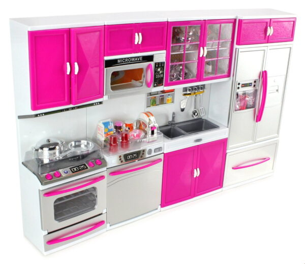 Toy Playset Kitchen Set Children Item. This modern kitchen play set comes with a doll and appliances that light up and make sounds just like an actual kitchen! The cabinets, oven, and refrigerator can be opened. The toaster also has a switch that can be pressed to mimic an actual toaster. This Bisontec My Modern Kitchen Full Deluxe Kit Battery Operated Kitchen Playset With Toy Doll, Lights, And Sounds is the perfect present for kids, makes an ideal party present, birthday present, birthday gift or just a fun kids toy at a clearance price under $50 you can’t miss.