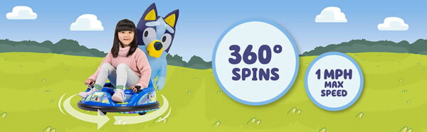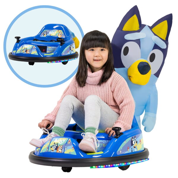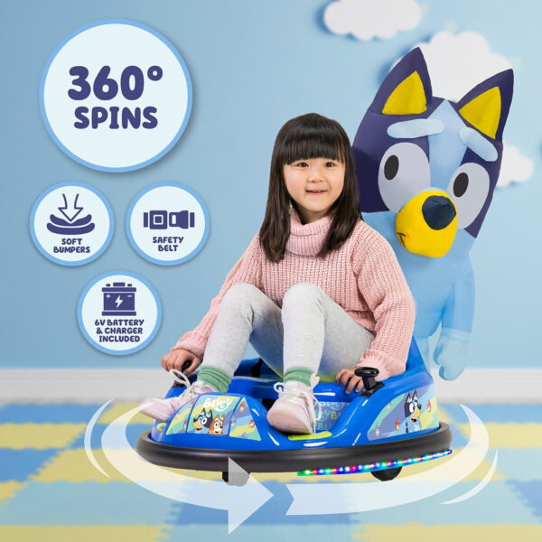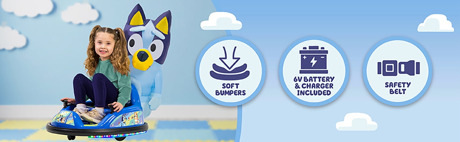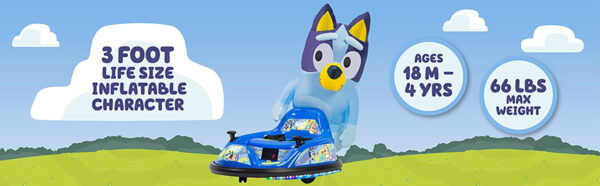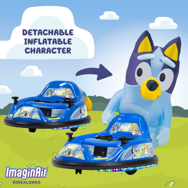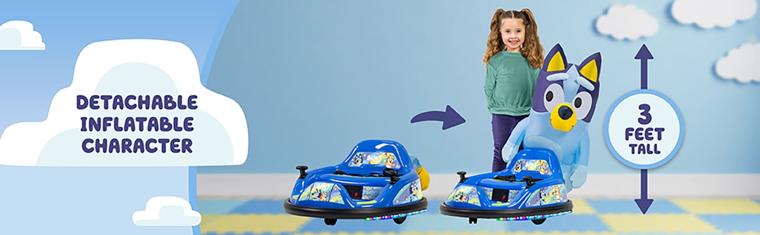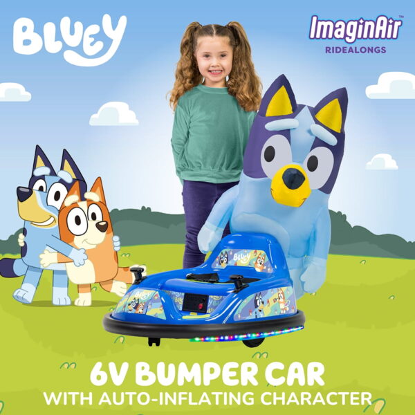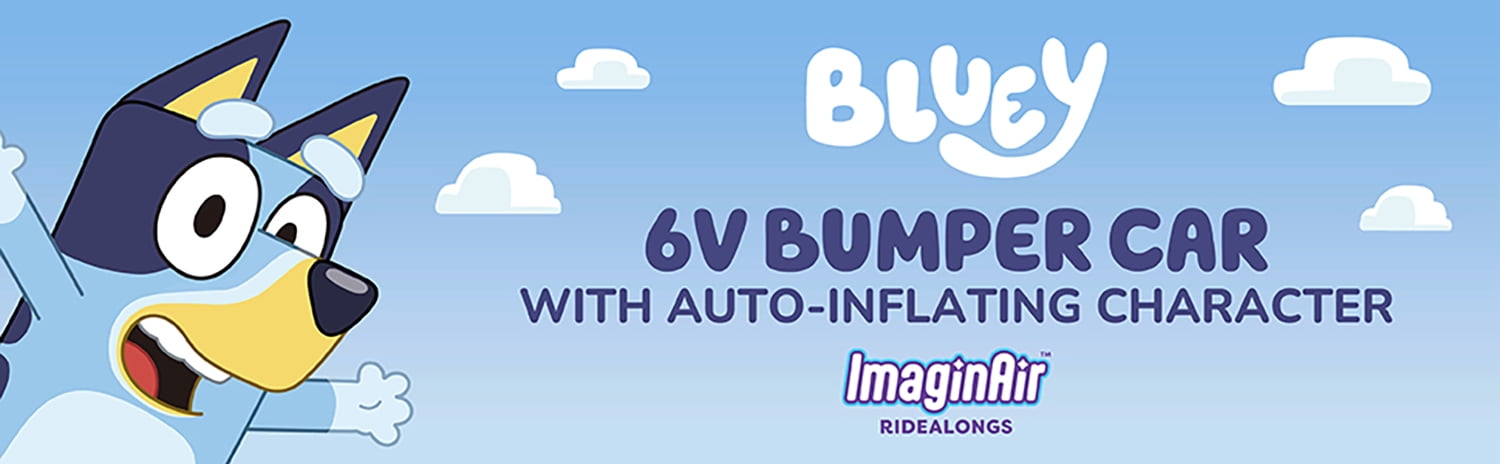 Bluey 6V ImaginAir Ride-On Bumper Car with Inflatable Character Inflatable Character: Bluey Inflatable instantly grows to 3 feet – just turn it on and go! Safety: Features an adjustable seat belt, 1.5 MPH max speed, and soft rubber bumper to protect walls and furniture 360-Degree Spins: Dual joystick controls allow for easy steering and full 360-degree turns, ensuring endless giggles and smiles Flashing LED Lights: Comes with exciting flashing LED lights that glow bright, enhancing the fun experience Easy Assembly: Vehicle comes fully assembled; simply attach the bumper, charge the battery, and it’s ready to go Rechargeable: Includes a 6V rechargeable battery and 120V wall charger for continuous playtime Character Storage & Dual Play: Ride with or without the inflatable character for double the fun, and when playtime is over, simply deflate and store the character in the back of the car