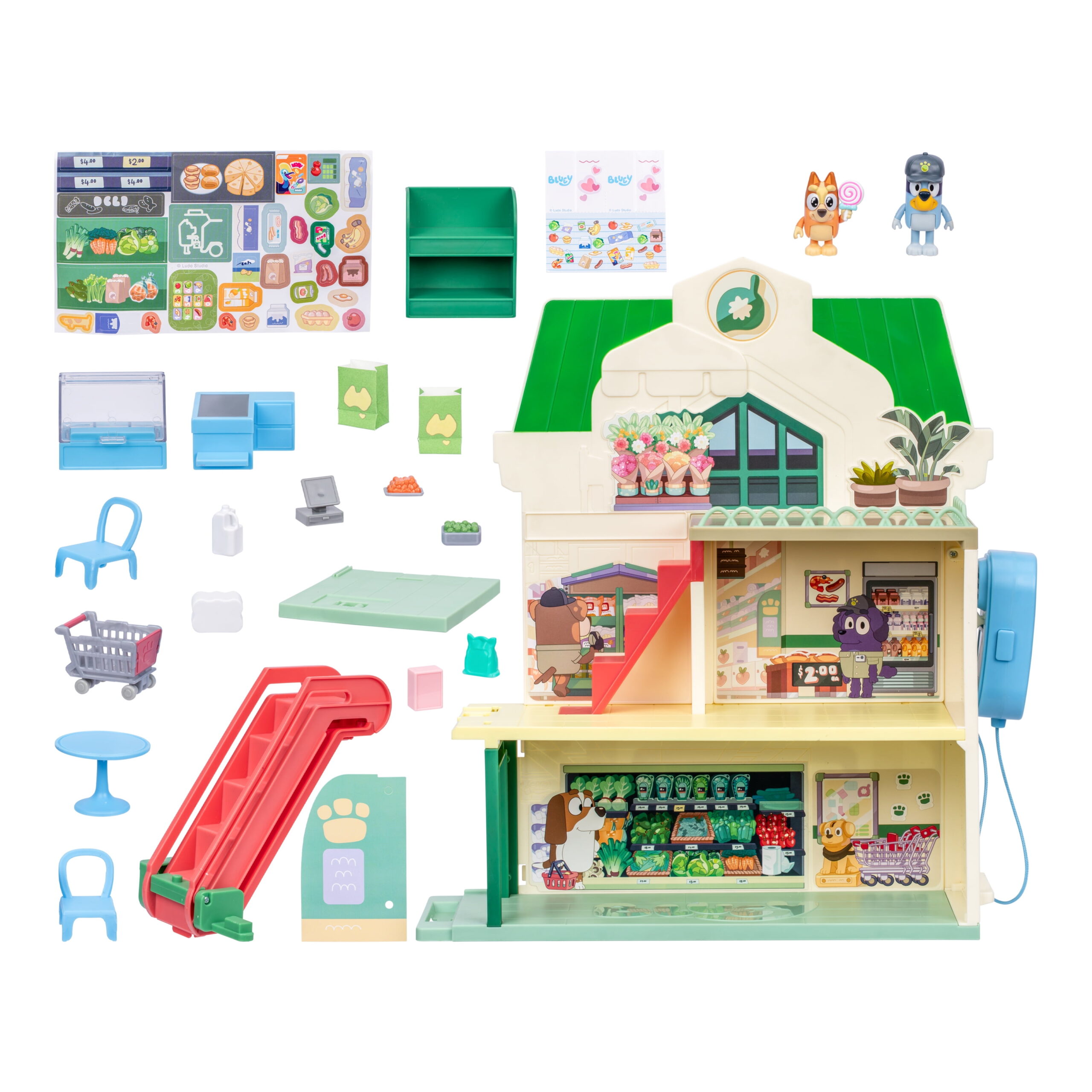 Let your child step into the world of Bluey with this incredible Supermarket Playset, packed with interactive features and endless fun. Inspired by the beloved episode “”Kids,”” this playset lets kids recreate memorable moments or imagine new adventures with their favorite characters. With three levels of excitement, this set is a must-have for every Bluey fan! This playset features two exclusive figures: Bluey dressed as a hardworking supermarket employee and Bingo holding her lollipop. These unique characters bring extra charm to the play experience and cant be found anywhere else. Perfectly sized for little hands, theyre ready to take on all the fun of the Supermarket! Kids will love placing Bluey and Bingo on the real working escalator to ride up and down between the levels. This exciting interactive feature adds a touch of realism and makes playtime even more engaging. Whether theyre heading to the rooftop caf or exploring the aisles, the escalator is a favorite activity for young imaginations. Bring the Supermarket to life with 24 amazing sound effects, including a lively intercom to announce fun store sounds. These interactive sounds make the playset even more immersive and keep kids entertained for hours. From beeping registers to bustling store noises, the sounds add an exciting touch of authenticity. With its impressive size and detailed design, this playset is the ultimate Bluey toy! Standing over 40cm tall, it features plenty of space for fun on every level and comes with over 15 play pieces, including shelves, carts, and more. Kids can decorate the Supermarket with stickers and explore countless ways to play with Bluey and her friends! CHOKING HAZARD – Small parts. Not for children under 3 years. 3 AAA BATTERY REQUIRED
