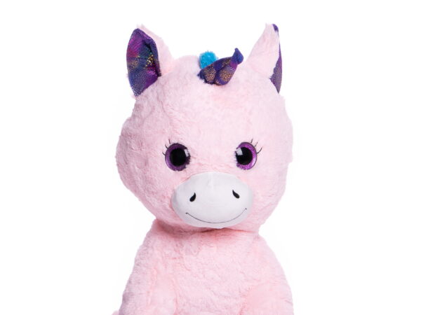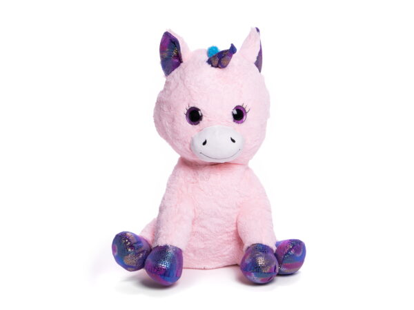 Bright Time Toys Astral the Unicorn 32 Inch Sitting A jumbo plush, Astral the Unicorn is pink with lavender hooves, horn, ears, mane and tail. Her favourite colour is lavender and she sits because she likes to look up at the stars. Created to be a child’s favourite plush, our detailed toys are cute, cuddly and squeezably soft. Made with love from premium fabrics and fillings, our plush have been designed to last for years to come. Check out our wide assortment of small, large and jumbo friends. Plush care: We recommend spot cleaning only.