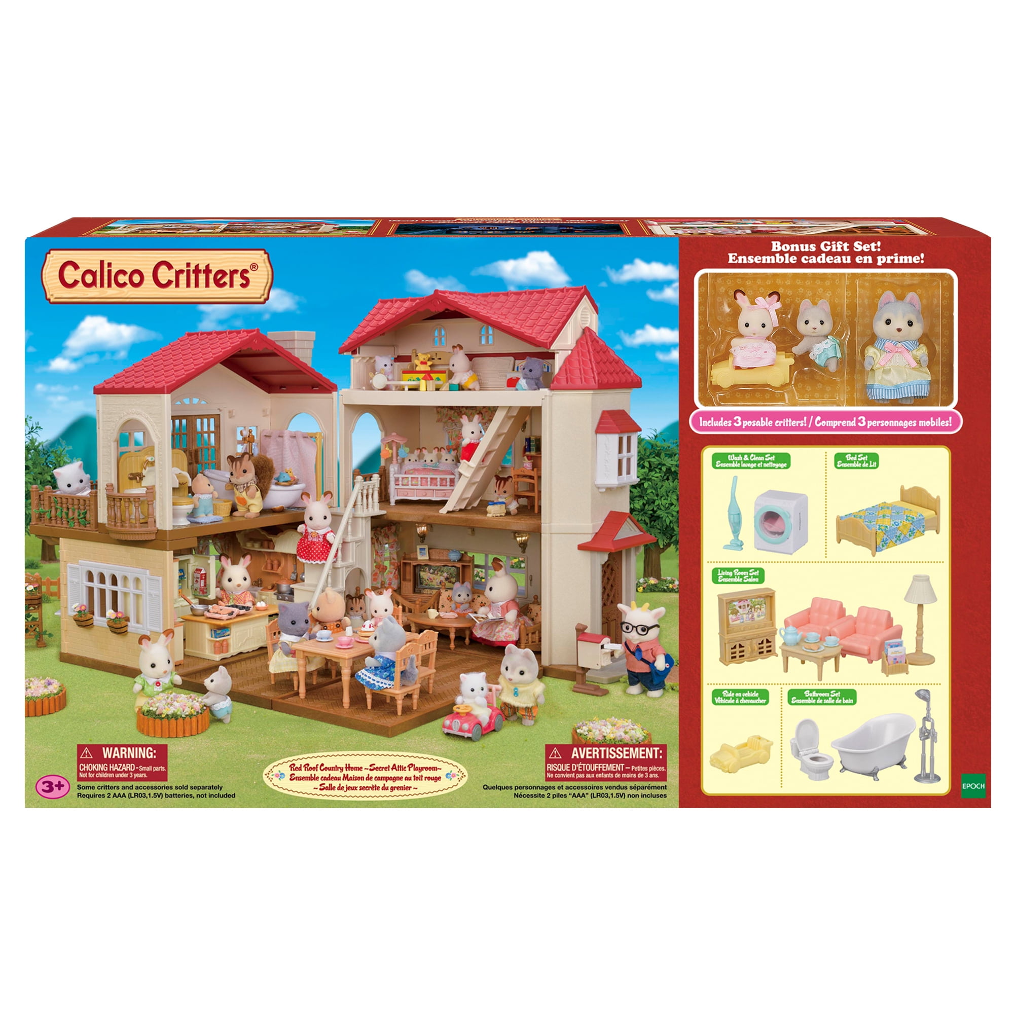 Red Roof Country Home Gift Set includes decorative furniture and accessories and 3 Calico Critter figures. The home can be opened for play at 90-degrees, 180-degrees, and any angle in-between. Home also closes for more play options and easy storage. Home lights up 3 lamps included. A second floor room and the roof piece are removable. Stack the rooms to create 3 levels. Set includes Husky Mother Avril, Husky Baby Linnea and Chocolate Rabbit Baby Creme. Red Roof Country Home connects to Red Roof Cozy Cottage (sold separately) to create a Grand Mansion. Choking Hazard – Small Parts. Not for children under 3 years.