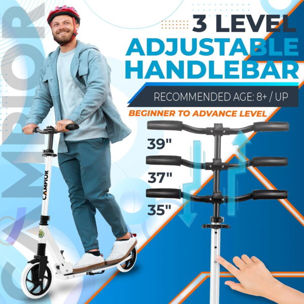 Campior Kick Scooter for Ages 6+, For Kids, Teens, and Adults, Max Load 240 LBS, Foldable, 8-inch Big Wheels for Kids and Adults, With Kickstand, 3 Adjustable Levels, Child Safety Approved, White