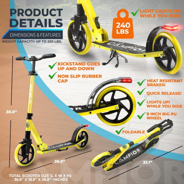 Campior Kick Scooter for Ages 6+, For Kids, Teens, and Adults, Max Load 240 LBS, Foldable, 8-inch Big Wheels for Kids and Adults, With Kickstand, 3 Adjustable Levels, Child Safety Approved, Yellow