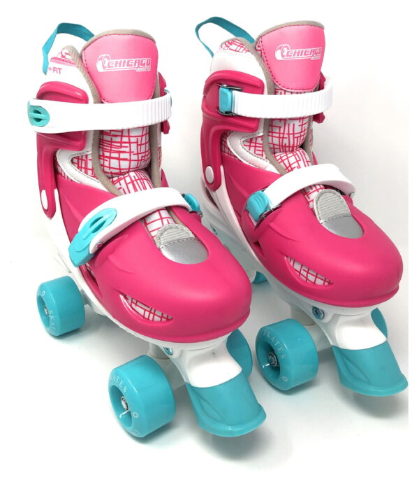 WHAT’S INCLUDED: Chicago Skates Adjustable Quad Roller Skate Combo Set includes the stylish Chicago Adjustable Quad Skates, knee pads, wrist guards, and safety helmet. Everything kids need for a fun, smooth, and safe roller-skating experience! ADJUSTABLE SKATES: Designed for the beginner, the Chicago Adjustable Quad Skates offer a multi-adjust boot that grows with the child. Easily adjust four full sizes with the push of a button. COMFORT & SUPPORT: Hi-top silhouette, two-piece boot construction, padded collar, breathable nylon mesh inner boot, and two micro ratchet buckles provide secure feel and fit CONTROL & STABILITY: Expect excellent traction and stability delivered by the 60mm composite wheels with 608ZB semi-precision speed bearings. Built-in toe brakes for safe and reliable stopping power. SPECIFICS: Pink/White/Teal. Adjustable youth size Small (1 4). Chicago Skates -the leading brand in the skating industry for over 100 years. Includes a 30-day manufacturer’s warranty.