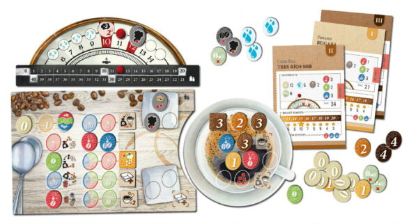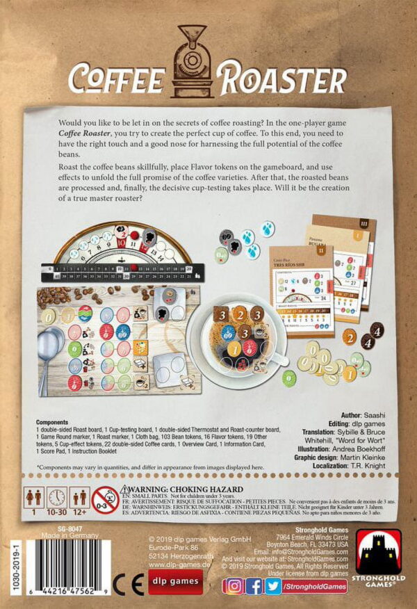 Coffee Roaster is a solitaire pool-building game. You choose a variety of coffee beans you want to roast, and put a number of tokens specific to that variety into a bag. Each turn, you draw a number of bean tokens randomly from the bag to advance their roast level. When you are finished, you make a cup-testing to check the taste of your coffee and score points accordingly. Each variety has its own target roast level, but approaching the target is not enough for perfect roasting; you also have to even out the roast level of each bean, while not spoiling the flavor of that variety. There are 22 varieties of beans in the game. In one game, you try to roast three of them, and your roaster title is awarded based on the total score. Enjoy the world of coffee-roasting, and aim for the ultimate titleMeister.