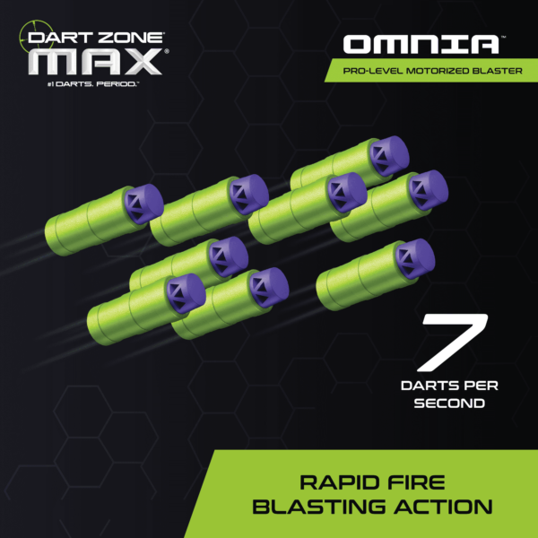 1 Dart Zone Max Omnia Pro Dart Blaster and 30 half-length Dart Zone Max Ruby Darts Features a 15-round half-length dart cartridge Tactical sight and iron sight offer maximum accuracy Max Ruby Darts blast up to 150 feet Max Eyewear Gear included for extra protection on the field Blast in comfort with the adjustable shoulder stock Choose between single, burst, and full-auto blasting modes Rechargeable battery pack Perfect for outdoor or open spaces