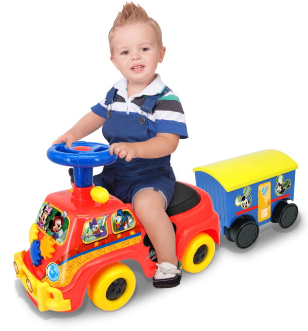 Disney Mickey Ride-on plays fun sounds and has flashing lights! Fun activities on the dashboard. Includes trailer for extra storage. Age range: 12 – 36 months Requires 2 x AA batteries (Try Me Battery Included) Gender neutral, suitable for both boys and girls