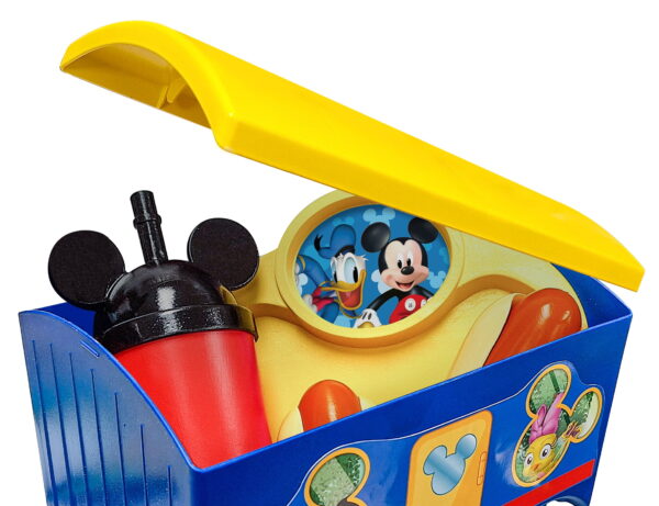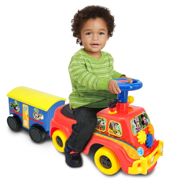 Disney Mickey Ride-on plays fun sounds and has flashing lights! Turn key, shift gears, press and turn for fun activities on the dashboard. Lift seat cover for extra storage under the seat. Includes trailer for extra storage. Safe and durable construction for hours of safe rides.