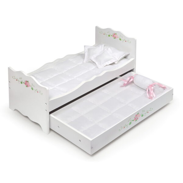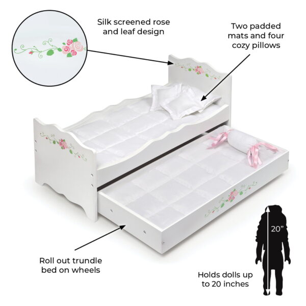 Badger Basket’s elegant White Rose Doll Trundle Bed with Bedding is ready for your doll and her BFF! This showy bed assembles easily and will be a treasured toy for your child, or a beautiful addition to your collector doll display. Includes padded mats and four pillows. Wheeled trundle can be tucked neatly under the bed from either side. Trundle bed is fully independent of the main bed and can be used separately. The head- and footboards of the doll bed feature fancy, scalloped details with silk-screened rose and leaf design. Bed is made with durable engineered wood with a white, painted finish. Removable bedding is made with 100% Polyester fabric with 100% Polyester fill. For Dolls up to 20 inches. Fits 18 inch dolls such as American Girl, My Life As, Madame Alexander, Ashton Drake, and Our Generation; and also fits 15 inch American Girl Bitty Baby dolls and 14.5 inch American Girl WellieWishers dolls. Overall bed measures 22.25 inches L x 11.25 inches W x 11.5 inches H. Interior of bed: 21.5 inches L x 10 inches W x 0.5 to 1.25 inches H. Overall trundle bed measures 20.75 inches L x 10 inches W x 3.25 inches H. Interior of trundle: 20 inches L x 9.5 inches W x 1 inch H. All measurements approximate. Wipe and spot clean as needed. Adult assembly required. Illustrated instructions included. For children from three years old and up. This item is to be used with dolls only and is never to be used with real infants or pets. /! WARNING: CHOKING HAZARD – Small parts. Not for children under 3 yrs. Product complies with all currently applicable safety standards. Product includes a limited warranty of 30 Days Parts to the original purchaser. Doll and doll clothes/accessories not included. Product may vary slightly from shown and described. Props/accessories shown are for illustration purposes only and are not included with the product. Actual color/finish may vary slightly from screen display. This item ships in its original carton which may include a product photo.