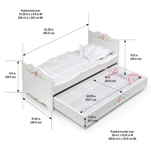 This elegant trundle bed is sleepover-ready for your doll and her closest doll friend Includes two deluxe padded mats and four pillows Fancy scalloped panels and pretty floral detailing For all dolls up to 20 inches including American Girl, My Life As, Madame Alexander, Ashton Drake, Our Generation, Bitty Baby, and WellieWishers Overall dimensions: 22.25 inches L x 11.25 inches W x 11.5 inches H Wipe and spot clean as needed For children from three years old and up Manufacturer’s 30 Day Limited Warranty