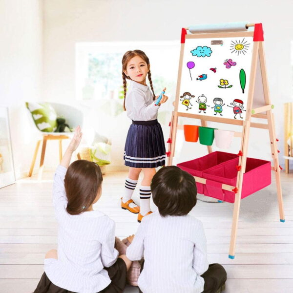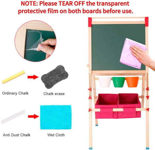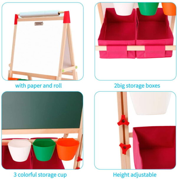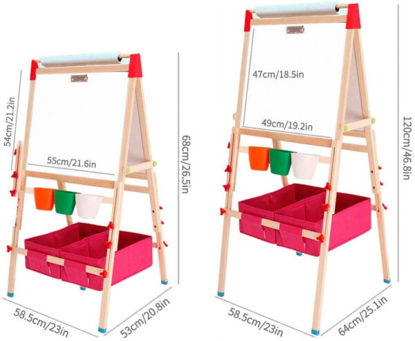 The DUKE BABY standing kids’ easels feature a dry-erase board and chalkboard, as well as included paper roll, giving your kids multiple platforms to extend their creativity. Your child can play with his/her friend to paint the chalkboard and whiteboard easel at the same time. These easels for kids come with 4 kinds of necessary kids art supplies such as markers, chalks, and magnets. The included storage bins and holders help to keep the kid art supplies organized. The adjustable height feature allows this kids art standing easel to grow with your kids. Kids can paint and write with our kids art set with easel to fully exert their imagination. Our art easel for kids ages 4-8 is a good gift choice for your children!