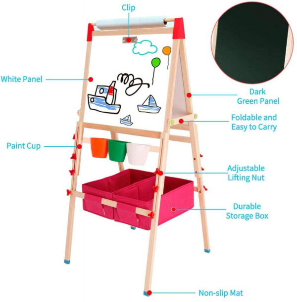 3 IN 1 ART EASEL – One side of kids easel is a dry-erase board, the other side is a chalkboard and equipped with a paper roll on the top, providing more choice for your kid. The kids art easel will lead your kids to enjoy the triple fun. Both sides of the art easel are magnetic, which can be used to attract magnets and create more funny activities. This kids easel with paper roll can be used by several children at the same time. WOOD FRAME AND CHILD SPEIFIC SCREWS – Our standing art easel is made from natural, beautifully crafted wood with no burrs or sharp edges. This wooden easel for kids is child-safe and stable with toxin-free finishes; kids art easel with paper roll complies with the highest quality standards. Easel for kids is equipped with child-specific screws and non-slip foot covers. Easel for kids ages 3-5 can be easy to clean with a damp cloth; and equipped with an A-shape design, this kids easel set will be sturdier & not shaky. ART SUPPLY SET STORAGE BOXES – The art easel for kids is equipped with two large storage boxes and three paint cups, you can store all important accessories; markers, erasers, a full set of colorful magnetic numbers, letters, etc. The double-sided kid art easel also allows kids to stack different shapes, letters, and numbers magnets to the board and learn. HEIGHT ADJUSTMENT DESIGN – The floor standing easels height can be adjusted from 26.50 to 47 inches, as the kids grow to meet different height requirements and deliver years of use. The height of the magnetic easel can be adjusted according to the different ages of kids. Children’s art easel can be folded for storage or into the car trunk go-out to sketch. It’s a fun activity child easel that’s a great tool for children and toddlers to learn how to paint, draw, write, sketch, and more! WIDE APPLICATIONS FOR PLAYROOM AND PRE-SCHOOL CLASSROOM – Wooden material with a light color theme of children easel goes well with most classrooms, kindergartens, playrooms, and families. Easel kids can be used as a teaching board, drawing board, graffiti board, and message board, and can stimulate children’s imagination and creativity. Art easel kids also allow children to have better extracurricular activities. WARNING _ CHOKING HAZARD – Contains small parts. Not suitable for children under 3 years. MAGNETIC LETTERS AND MUMBERS The double-sided art easel that allow kids to stack different shapes, letters and numbers magnets to the board and learn.