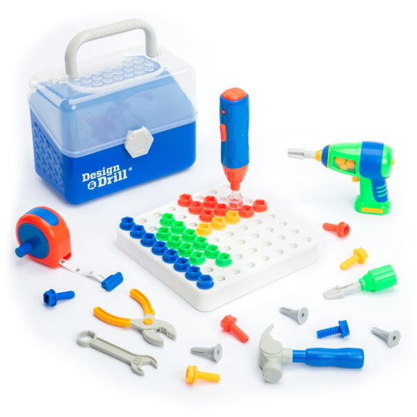 Educational Insights Design and Drill Toolbox, STEM Construction Toy, Ages 3+ Drill, hammer, measure, and more with real, working tools for kids! With the Design & Drill Toolbox, little builders can power up pretend play and work on important fine motor skills with each kid-safe tool. Store everything in the toolbox and take it anywhere fun goes for hours of construction creativity! Includes 50 bolts, 15 nails, 2 drilling boards, and 7 tools: power drill, power screwdriver, tape measure, hammer, pliers, combination wrench, hand screwdriver, and 3 bits (socket, Phillips, flat tip). Power tools each require 2 AA batteries (not included).