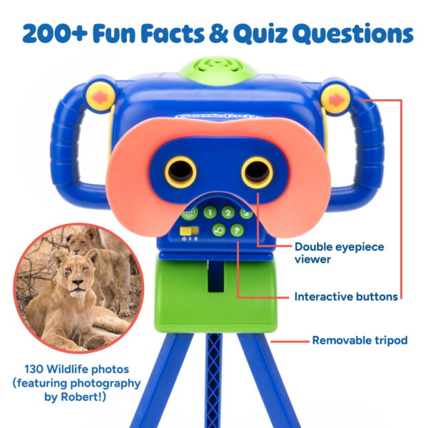 LOOK, LISTEN & LEARN: It’s a GeoSafari Jr. safari viewing adventure! Curious, animal-loving kids will love viewing high-resolution images while learning cool facts from none other than Robert Irwin VOICE & PHOTOGRAPHY OF ROBERT IRWIN: Wildlife Warrior Robert Irwin from Australia Zoo is ready to take you on a fact-packed journey using his own photos with this viewfinder-style toy SPARK A LOVE FOR SCIENCE: With STEM toys like the Talking Wildlife Camera, kids as young as 3 years old can start developing an early interest in multiple fields, from biology to astronomy and beyond INCLUDES: 130 built-in HD images, removable tripod, dual eyepiece, and 2 modes of play (Fact Mode & Quiz Mode) with over 120 fun facts and 120 quiz questions. Requires 3 AAA batteries (not included). Perfect for preschoolers THE PERFECT GIFT: Have an upcoming birthday or holiday? Educational Insights toys & games make the perfect activity for the home or classroom, no matter the occasion