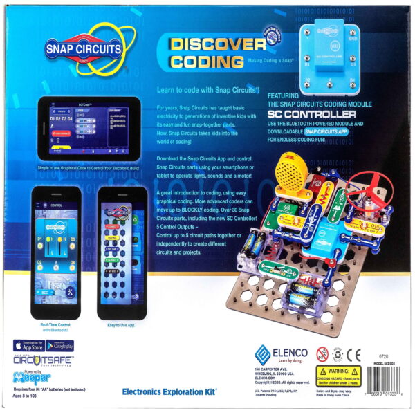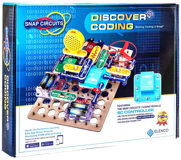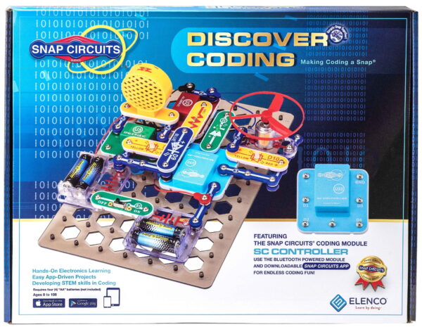 Discover the exciting world of coding with the Elenco Snap Circuits Discover Coding kit. This innovative set allows you to learn the basics of coding through easy-to-use graphical coding and more advanced BLOCKLY coding. Control lights, sounds, and a motor using your smartphone or tablet and the included Bluetooth-powered SC Controller. Explore circuitry, electronics, and more with the illustrated, full-color project manual. Perfect for budding engineers aged 8 and up, this kit provides a fun and engaging introduction to the fundamentals of coding and electronics.