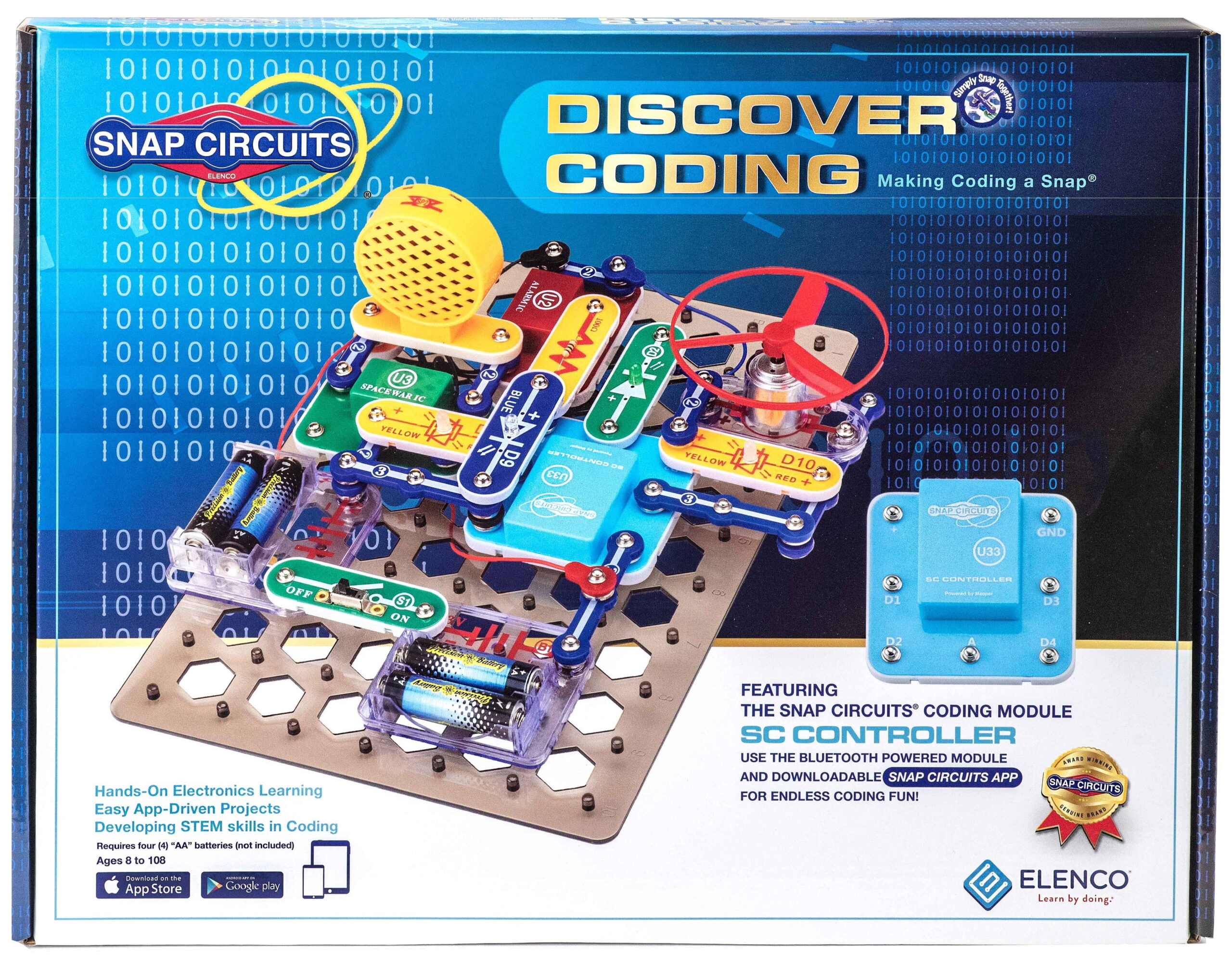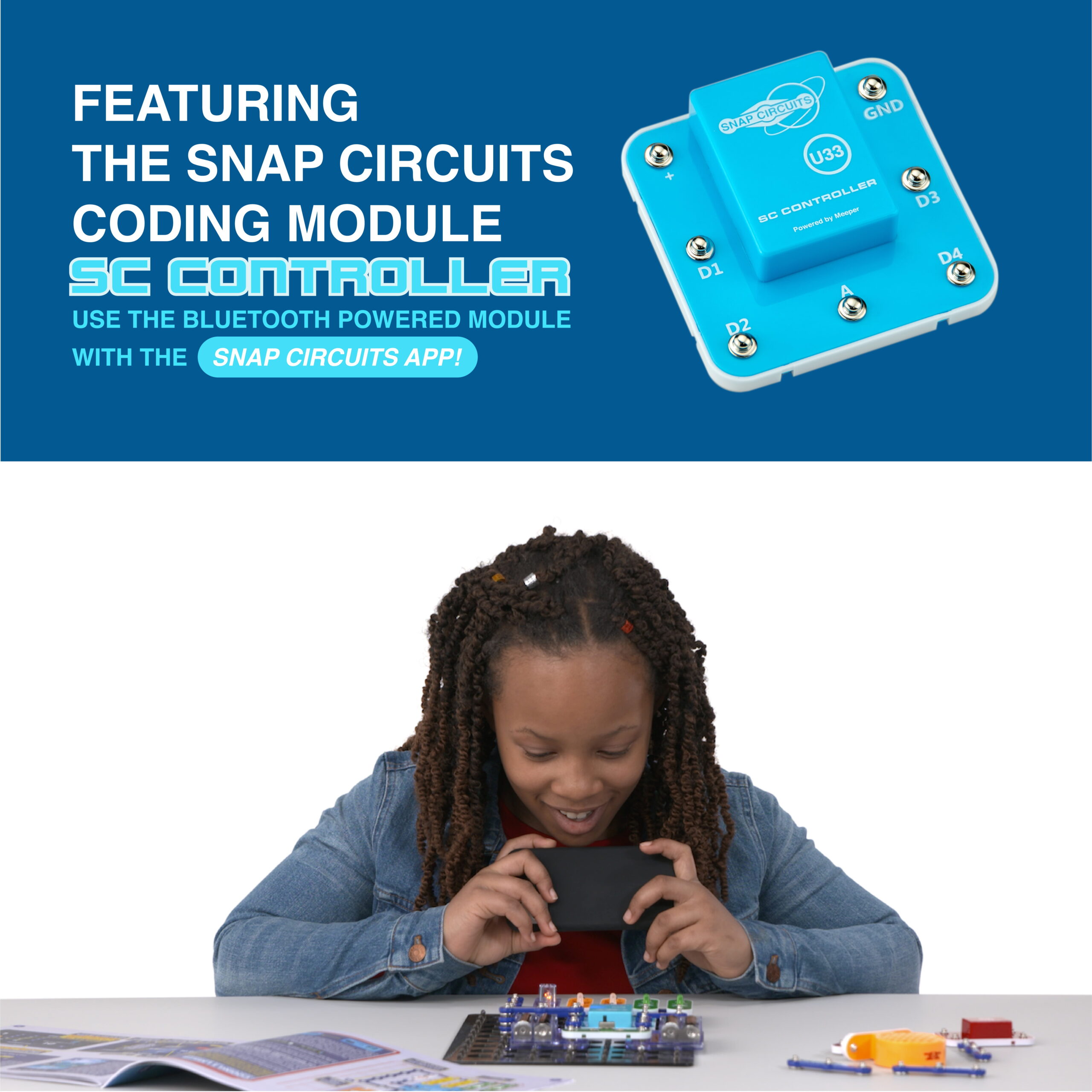 Learn about circuitry, electronics, and much more with the Snap Circuits Discover Coding kit! Includes an illustrated, easy-to-use, full-color project manual that explains electrical and coding concepts and includes exciting coding challenges. Comes with over 30 Snap Circuits parts, including the new Bluetooth-powered SC Controller. Control up to 5 circuit paths together or independently to create different circuits and projects. Discover Coding is a great introduction to coding, using easy graphical coding. Great way to learn the basics of coding and control lights, sounds, and a motor using your smartphone or tablet. Includes a Bluetooth-powered module for wireless control of your projects. Complete projects using the Snap Circuits App.