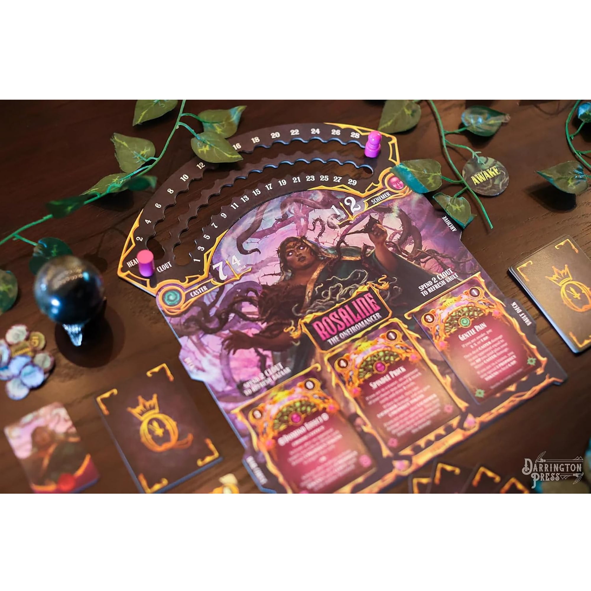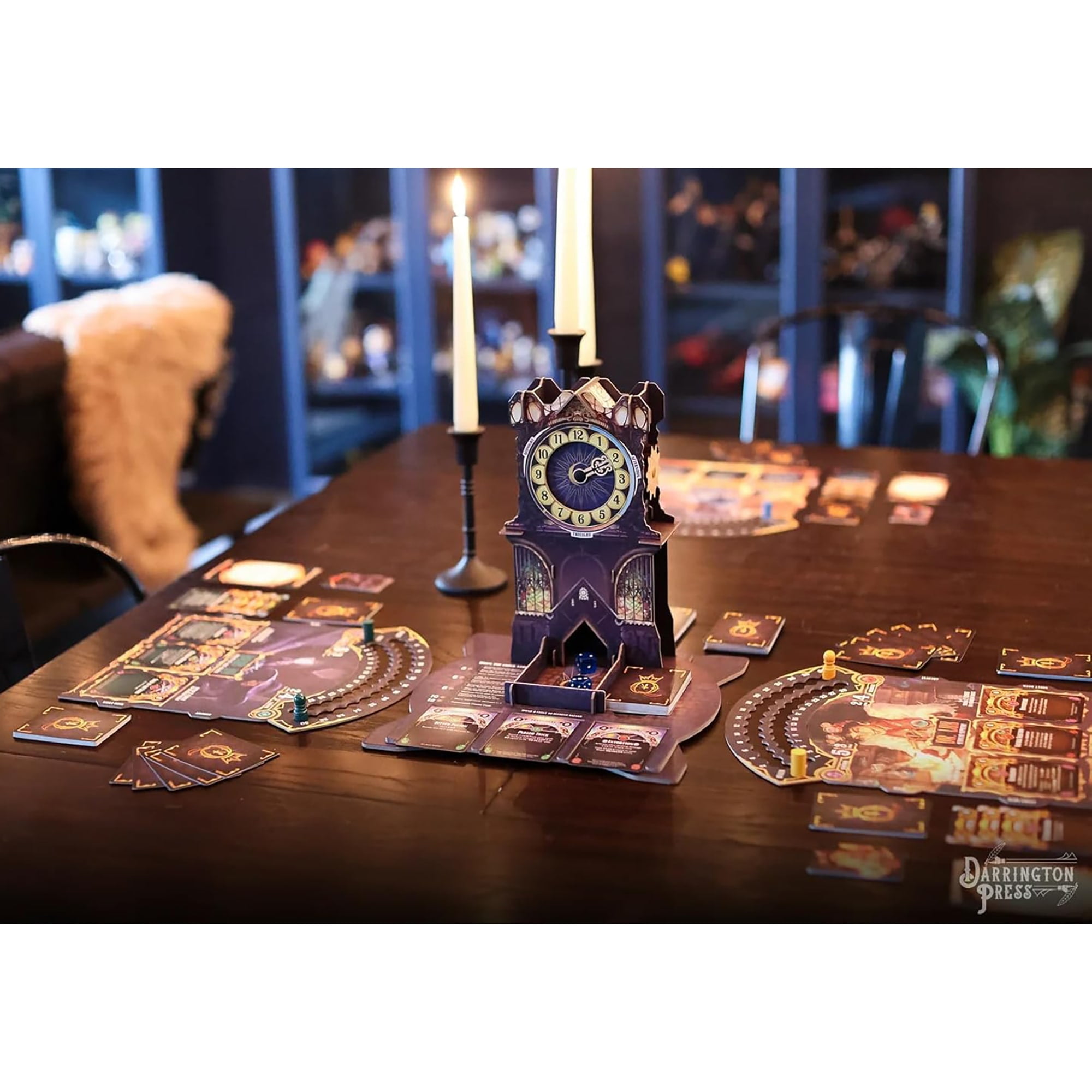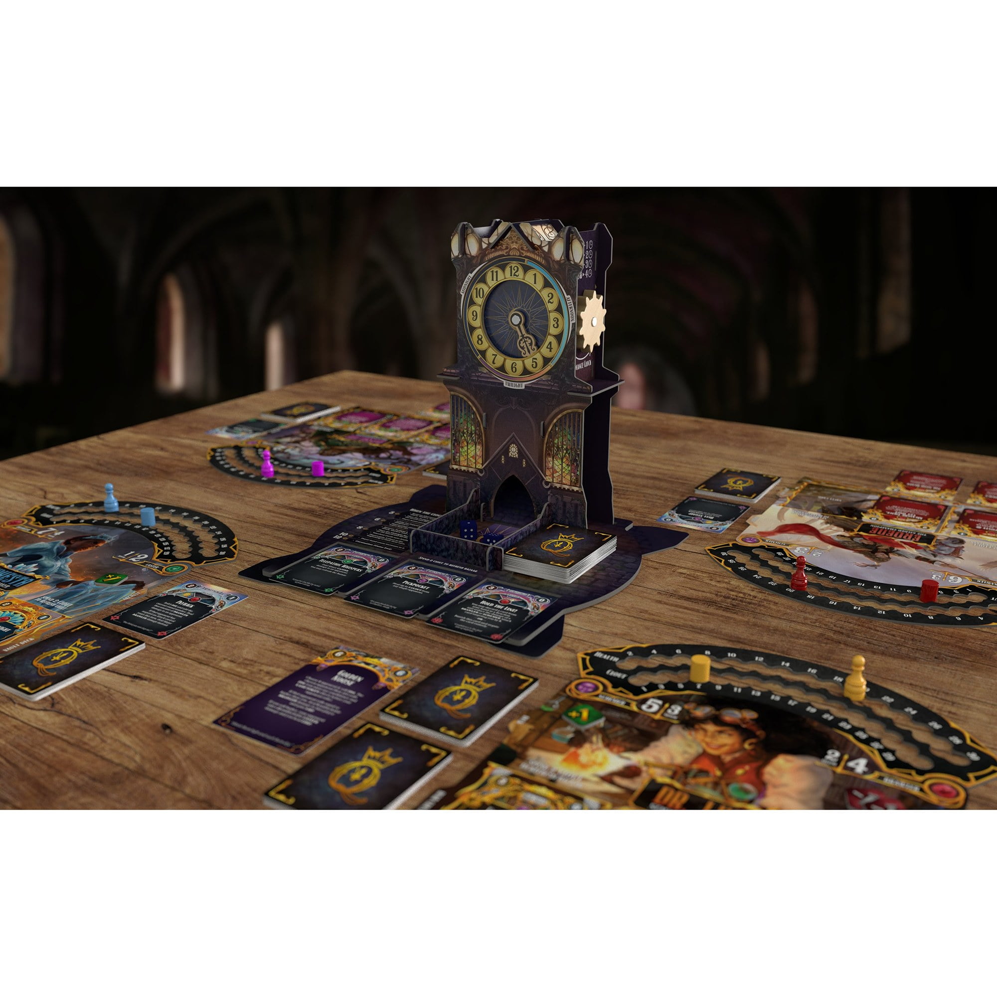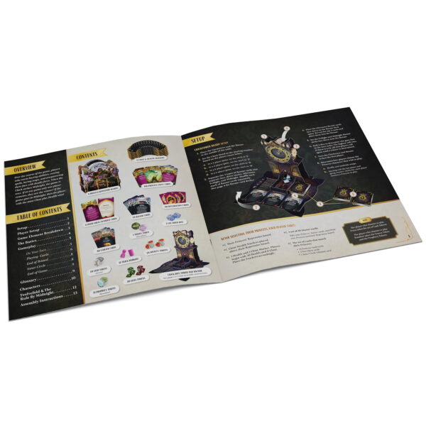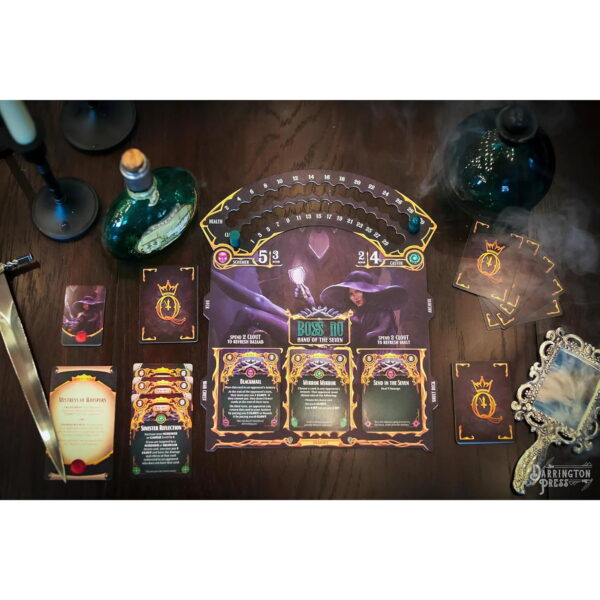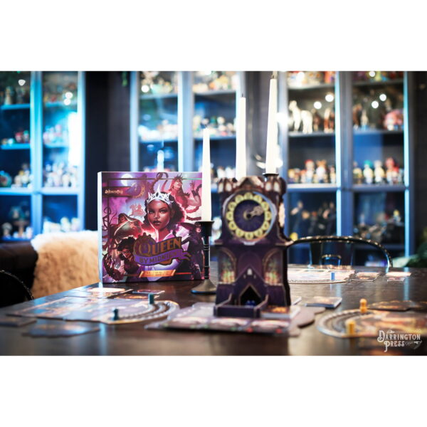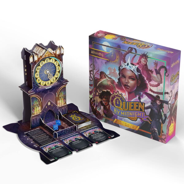 QUEEN BY MIDNIGHT – The Midnight Queen is dead As her kingdom weeps, the Queens dying command was to invoke the Rule By Midnight: a trial of combat and guile, where the Princesses of the Twelve Lands meet in secret to battle and scheme against one another. At the stroke of midnight, the most powerful Princess left standing will be crowned the new Midnight Queen! Queen By Midnight is a battle-royale deck-building card game of guile, deception, and brawn! Six Princesses each feature unique tactics to battle for the right of the Midnight Court, but only one (and maybe their inner circle) will be the winner. This game features a table presence you wont see anywhere else, with its intricate Dice Clock Tower that spins to face each player on their turn, keeps track of the round, presents new cards to buy, and even acts as a dice roller! CLOCK DICE TOWER: The centerpiece of this game is a stunning Clock Dice Tower that tracks turns, offers cards to buy, and rolls your dice! It spins to face each player on their turn. Nearly 200 cards are themed to your specific Princess, with an additional 75 Bazaar cards available to customize your deck. Tokens, trackers, boards, and other cards make gameplay easy to track even when things are getting heated. KEY DETAILS: Players: 36. Play time: 6090 minutes. Ages: 12+.
