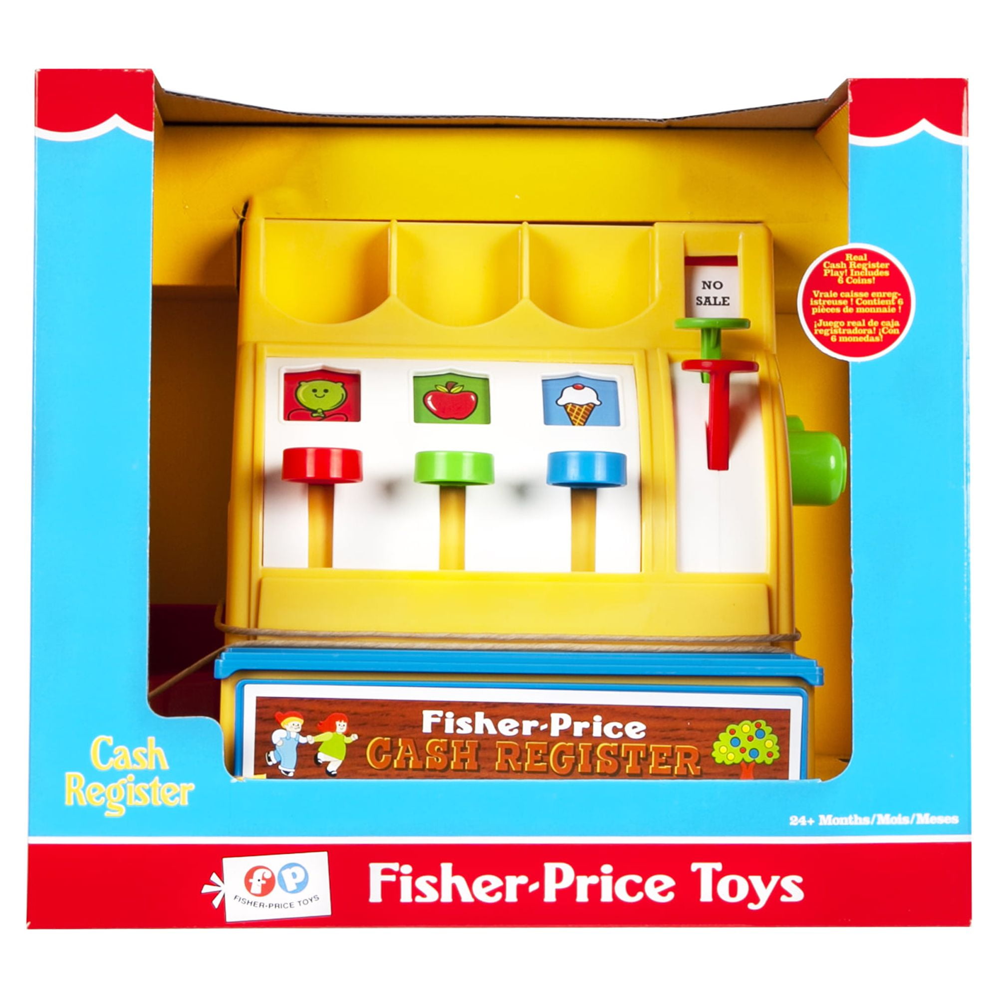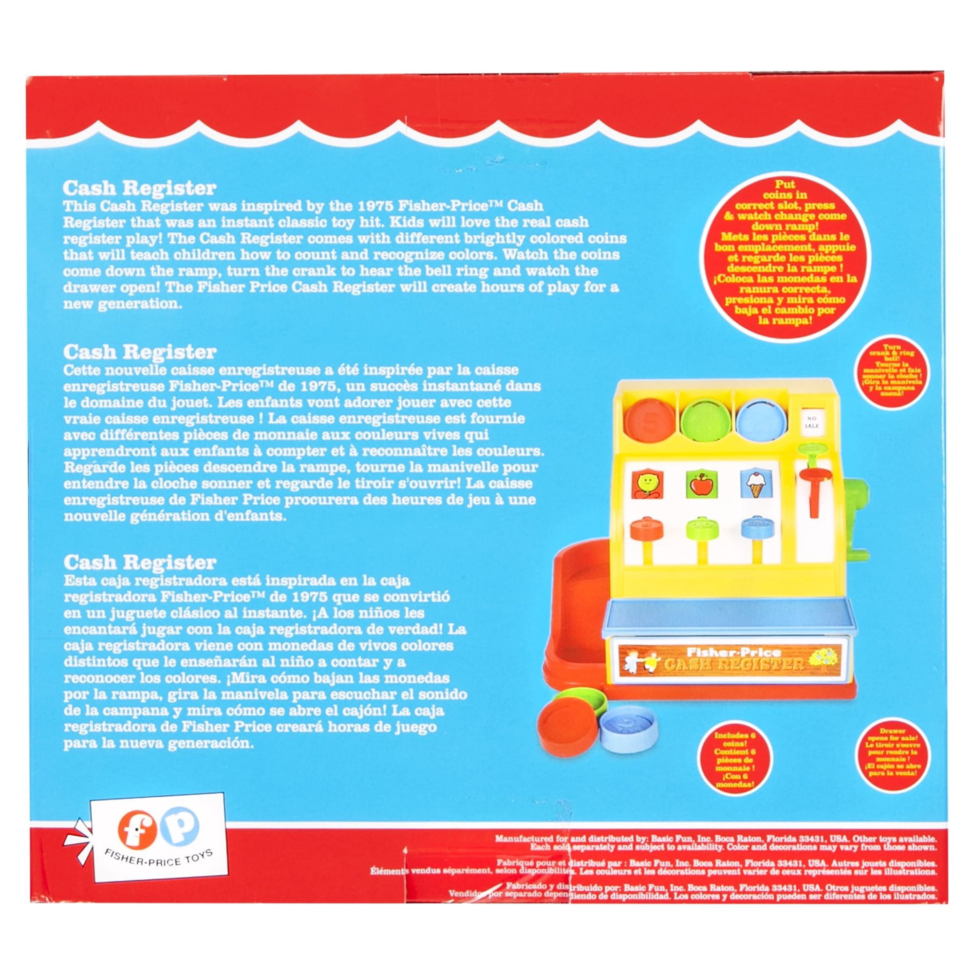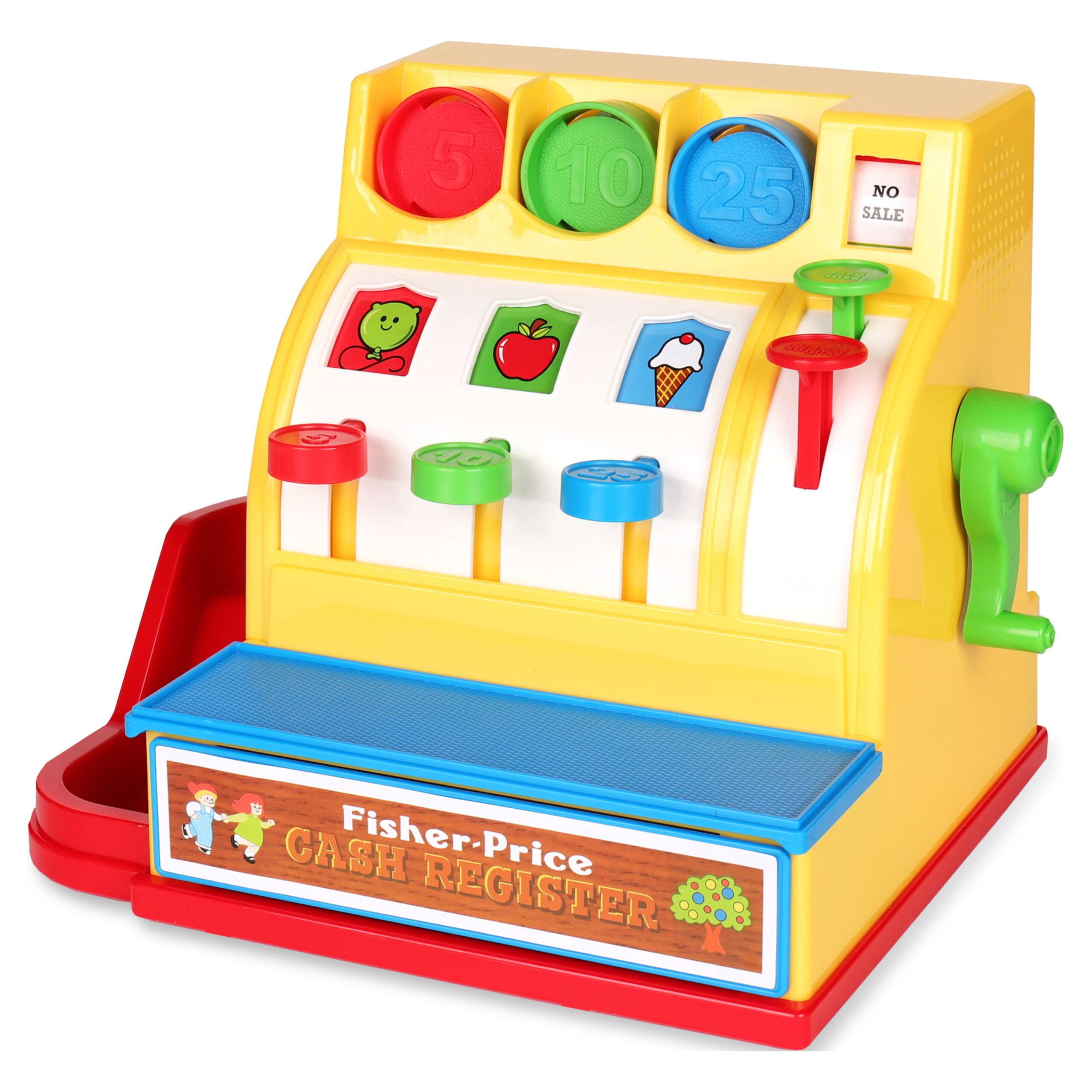Iconic cash register design with coins, ringing bell and working cash drawer. Teaches children about money and motor skills. Watch the coins come down the ramp, turn the crank to hear the bell ring and watch the drawer open! Makes a great gift for babies and toddlers ages 18 months and up for hands-on, screen-free play!!