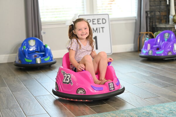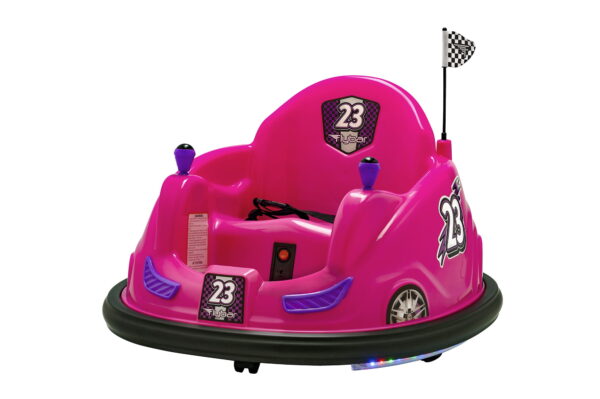 Flybar 6V Bumper Car, Battery Powered Ride On, Fun LED Lights, Includes Charger, Maximum Speed 1 MPH, Pink: Age: 18 months – 4 years Weight: Up to 66 lbs Lights & Action: Fun, exciting flashing LED lights glow bright. Watch your childs face light up as they drive and bump their way all around the hous Bump & Play: Car spins 360 degrees and provides screen-free, exciting entertainment. Your child will giggle and smile as they spin and bump Lights & Action: Fun, exciting flashing LED lights glow bright. Watch your childs face light up as they drive and bump their way all around the hous uality & Durability: Built with a tough plastic shell and a soft rubber bumper to protect walls and furniture Made For Safety: Features an adjustable seat belt, 1 MPH max speed, and anti flat tires Dual Joystick Controls: Easy-to-use dual joysticks for spinning 360 degrees and steering the ride on baby bumper car Design: Decorative stickers, headlights, taillights, and your own racer flag Power: Includes 6V rechargeable battery and 120V wall charger. Power up the fun whenever you want. Charge fully before use. Assembly: Vehicle is fully assembled. Attach the bumper, charge/connect the battery and go Flybar Bumper Cars: Other colors and characters may be available. Look for them today
