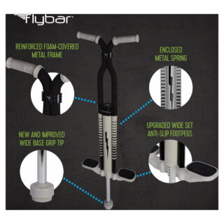 Flybar Master 2.0 Foam Pogo Stick for Kids Ages 9 and Up, 80-160 Pounds, Outdoor Kids Toys, Pogo Stick for Boys and Girls, Rubber Grip, by The Original Pogo Stick Company PERFECT FOR OLDER KIDS: This Flybar Pogo Stick is an ideal pogo for beginners to advanced riders. Designed for kids ages 9 and up with weight ranges from 80-160 pounds NEW AND IMPROVED: Features a fully enclosed spring thats surrounded by a foam-wrapped metal frame. The soft foam material offers a really cool look while also providing protection for your child SAFETY FEATURES: Reinforced shaft, piston, and spring, The core components have been reinforced for strength and durability. Show off your tricks with ease NON-SLIP FOOT PEGS: Wide textured footpegs increase stability. The pegs are also reinforced for safety and balance. The wider tip provides a stable, smoother bounce THE ORIGINAL POGO STICK COMPANY: Flybar has been in business since 1918 and continues to be “the standard by which all pogos are measured.” You can be assured that everything we make is the best of the best Unisex for boys and girls