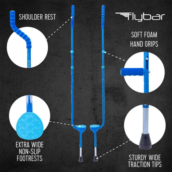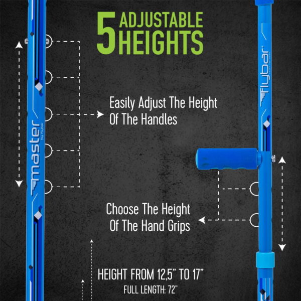 The Flybar Master Walking Stilts is a brand new and innovating product from Flybar Our stilts are ergonomically designed to make learning how to stilt walk easy You’ll be up and walking in no time Improve your balance and coordination once you master the Flybar Master Stilts, you’ll see how much your balance has improved Beautifully and ergonomically designed hand grips and shoulder rest the padded hand grips make for a comfortable riding experience while the shoulder rests go behind your shoulders to ensure you’re standing up straight Not to mention that they look great too Adjustable Height the Master Stilts have 5 adjustable heights from 12.5″ 17″ off the ground The full length of the Master Stilts is 72″ long Extra wide non-slip footrests and sturdy traction tips wider than any recreational stilt in the market; the Flybar Master Stilts have extra wide footrests for maximum stability and comfort The sturdy rubber tips will make for a more stable stilting experience and can be used indoors and out