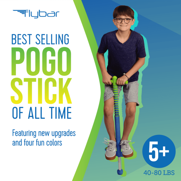 New and Improved Flybar Maverick 2.0 Pogo Stick Offering a great introduction to pogo stick jumping, the Flybar Maverick 2.0 pogo stick is ideal for beginner and intermediate riders. The Maverick 2.0 boasts a rugged metal frame covered with foam. As a result, it is sturdy yet safe, a must for kids who are just learning the ropes. The Maverick’s precision design also includes extra-wide and deep footpads, along with easy-grip handles and a rubber tip to help the rider stay in control. The tip cap is covered to help keep debris out and give it a new refreshing look Designed for children between the ages of 5 and 9 years old, the Maverick 2.0 supports 40 to 80 pounds and comes fully assembled. Invite friends over and let the fun begin! Great gift for boys and girls