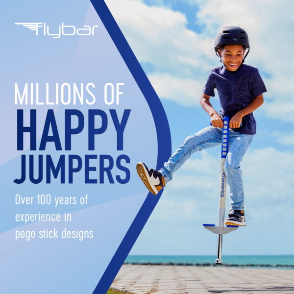 Flybar Maverick Pogo Stick for Kids Ages 5+, 40 to 80 Pounds, Perfect for Beginners, Easy Grip Handles, Anti-Slip Pegs, Outdoor Toys for Boys, Jumper Toys for Girls, Outside Toys for Kids PERFECT FOR THE FIRST-TIME JUMPER: This pogo stick for 5 year old is a great entry-level pogo for your child to learn the basics. Before you know it, theyll be an expert FOAM COVERED METAL FRAME: This Flybar pogo stick features a fully enclosed spring thats surrounded by a foam wrapped metal frame. The soft foam material offers a really cool look while also providing protection for your child SAFETY FEATURES: Foam pogo jumper for kids offers sturdy, non-slip foot pads and wide bounce tip for increased stability, balance, and control NO ASSEMBLY REQUIRED: The Maverick comes ready to bounce straight out of the box, so kids will be jumping in seconds. Parents will love how easy it is to get this toy set up and ready for playtime TRUSTED FLYBAR QUALITY: As the original Pogo Stick Company since 1918, Flybar continues to set “the standard by which all pogoes are measured”, ensuring the best quality and experience for users No Assembly Required Unisex: for both boys and girls