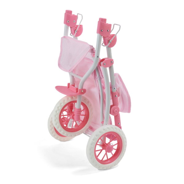 Badger Baskets Folding Three Wheel Doll Jogging Stroller has style from all angles! This three-wheeler is sure to be noticed thanks to the canopy, seat harness, footrest, padded handle, and 3-point seat harness. The three fixed (non-swivel) wheels roll smoothly. Canopy folds out of the way so your doll goes in and out easily. Height adjustable handle makes it fun for siblings to share. Handy, easily accessible, storage basket behind the stroller and holds all of your dolls things for the day. Stroller quickly folds for travel and storage. Stroller frame features safety locks to prevent accidental folding. For Dolls up to 22 inches. Fits 18-inch dolls such as American Girl, My Life As, Madame Alexander, Ashton Drake, and Our Generation; and fits 15-inch American Girl Bitty Baby dolls and 14.5-inch American Girl WellieWishers dolls. Made with metal, plastic, fabric, and EVA. Overall assembled dimensions 26 inches L x 15.5 inches D x 30.5 inches H. Handle height is 18 inches H in the lowest position and 30.5 inches H in highest position. All measurements approximate. Wipe, spot clean, and hand wash as needed. Adult assembly required (no tools needed). Illustrated manual included. Stroller should be folded and unfolded by an adult only. For children from three years old and up. This toy is for dolls only and is not for use with real infants or pets. /! WARNING: CHOKING HAZARD – Small parts. Not for children under 3 yrs. Product complies with all currently applicable safety standards. Product includes a limited warranty of 30 Days Parts to the original purchaser. Doll and doll clothes/accessories not included. Product may vary slightly from shown and described. Props/accessories shown are for illustration purposes only and are not included with the product. Actual color/finish may vary slightly from screen display. This item ships in its original carton that may include a product photo. This doll stroller recommended for indoor use only.