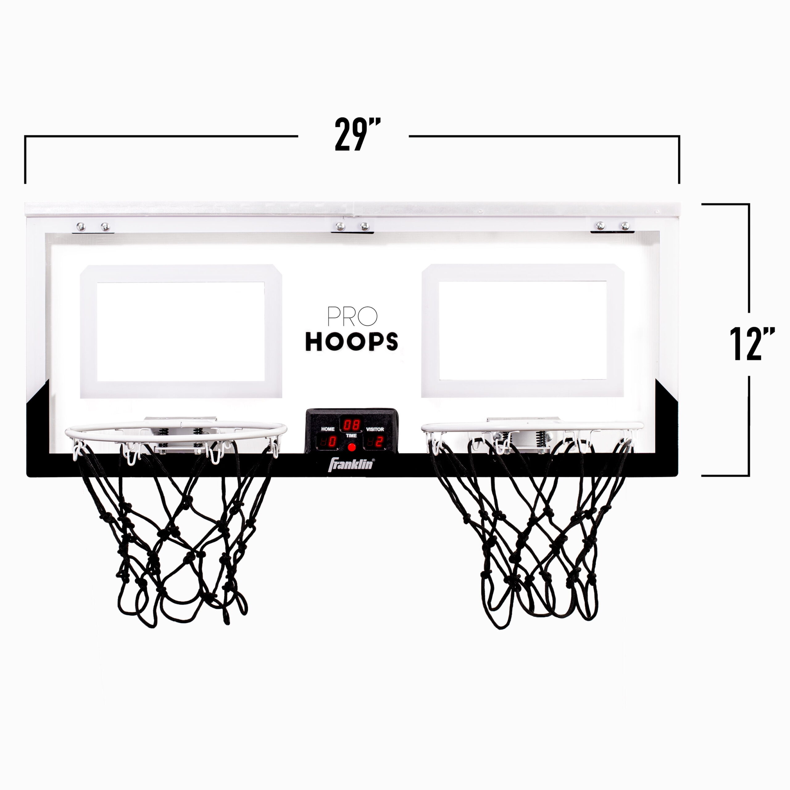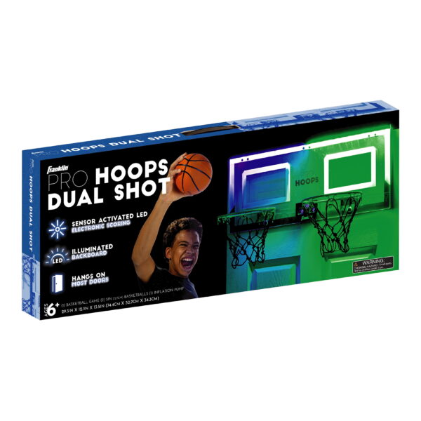 Instantly turn any room into a basketball court with Franklins Basketball Pro Hoops Set. This portable over the door game brings the fun and excitement of basketball conveniently indoors so that you can practice your shot anytime, anywhere. Our proprietary two player lasers scoring LED technology allows you and your friends to try and outscore one another while racing the clock. See who will be the slam dunk champ! The hoop fits easily over most doors and includes a mini, inflatable basketball and air pump (needle in the handle cap) so that you can enjoy endless hours taking free throws.