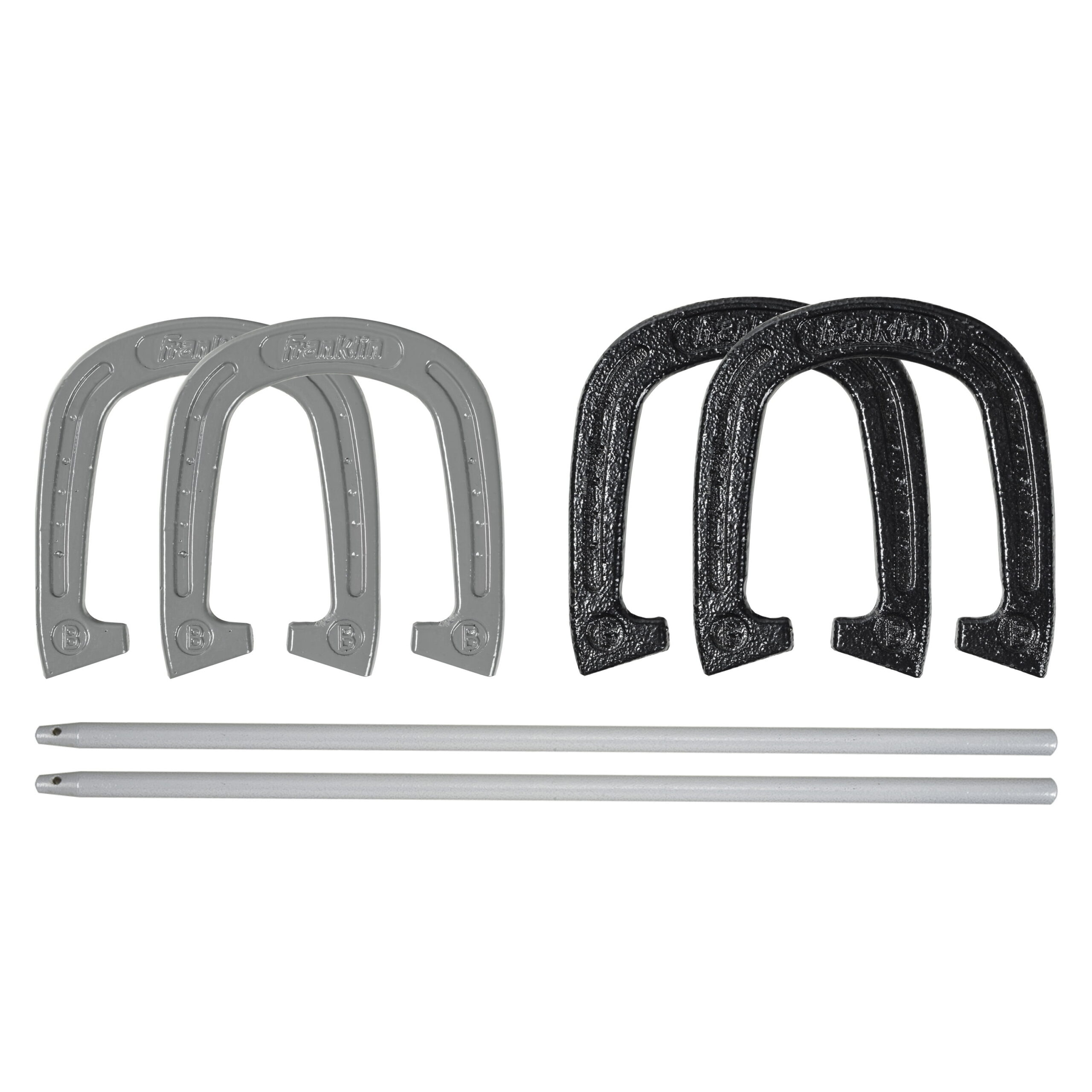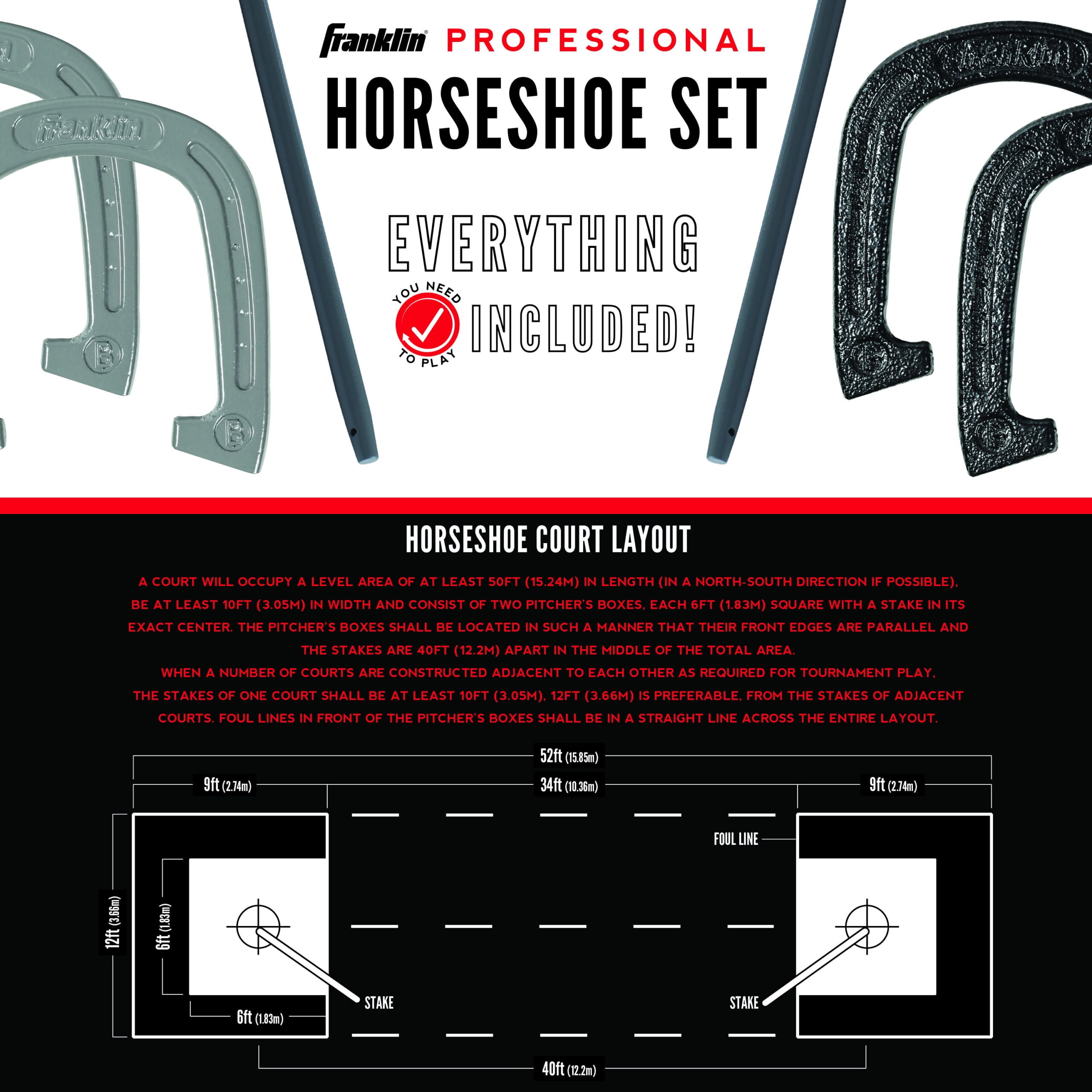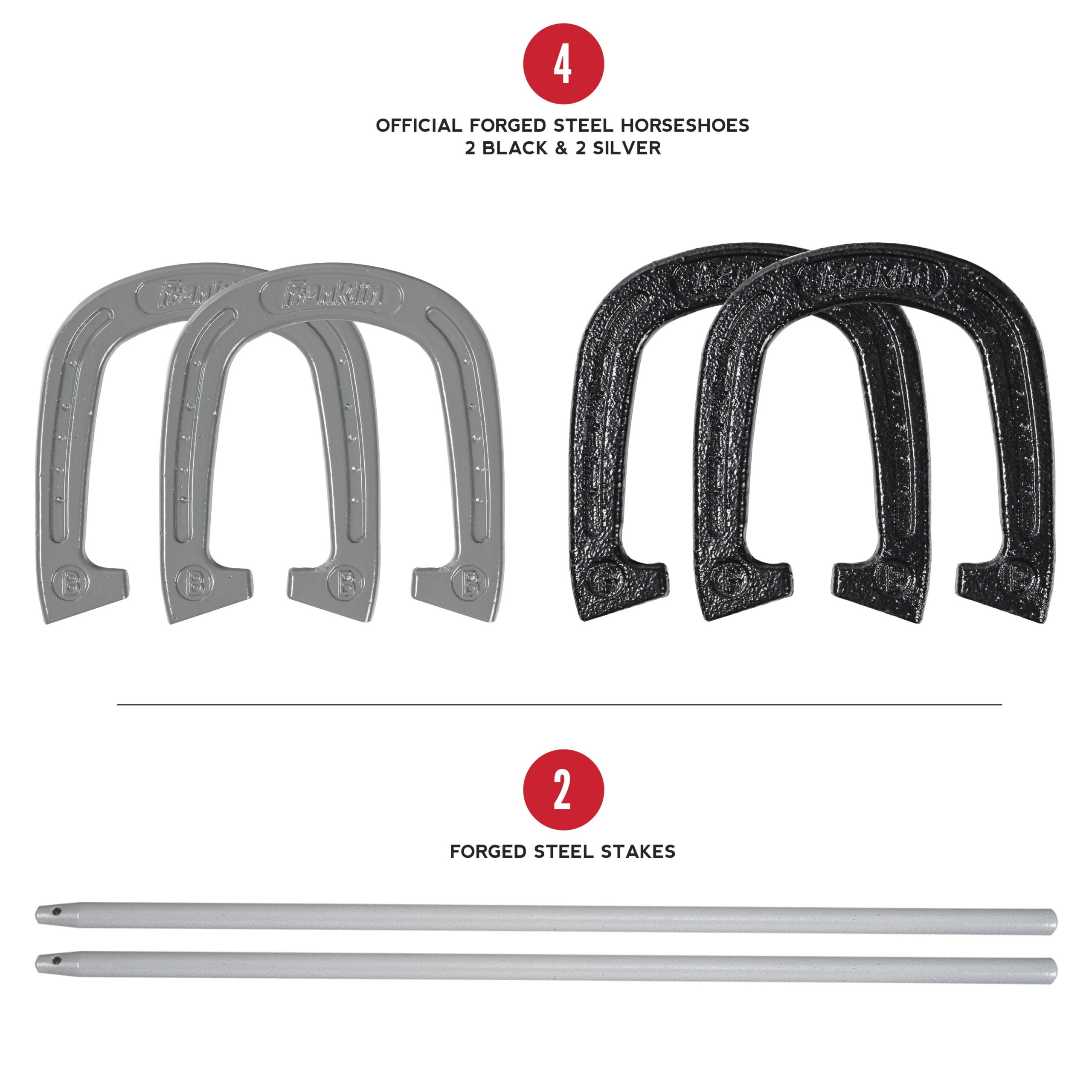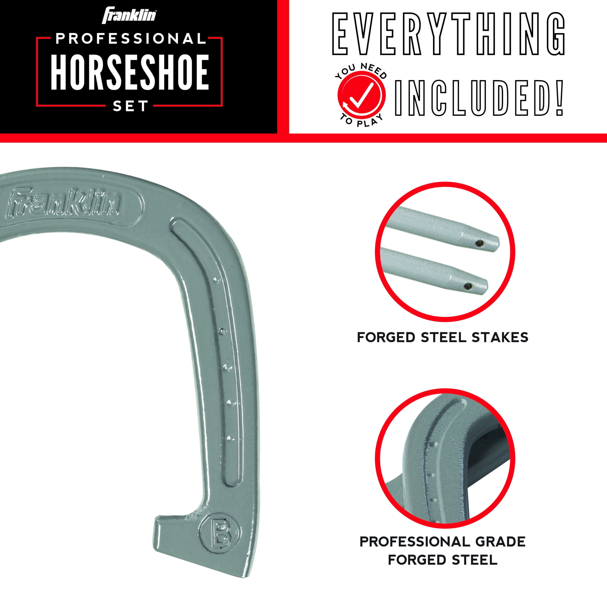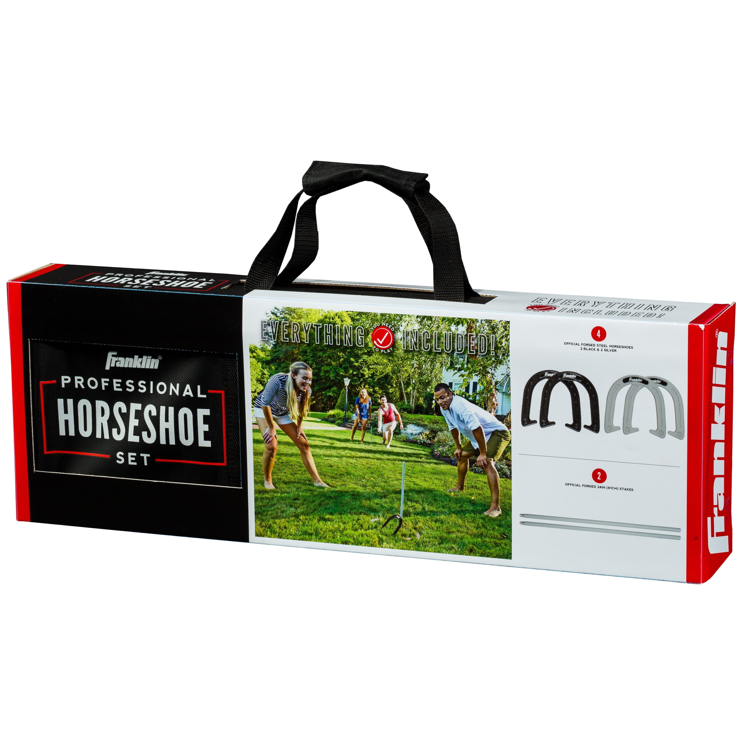 OFFICIAL SIZE AND WEIGHT HORSESHOES: Look no further for an official size set. This Franklin Sports horseshoe set includes (2) black horseshoes and (2) silver horseshoes that are made of forged steel NEWLY ENGINEERED starter set includes all you need to play and has been made for decades to maximize playability SOLID STEEL STAKES: (2) 23.5 inch chrome-plated solid forged steel stakes are included in the set. After placing these at least 9-10 inches into the ground, your horseshoe game is ready to be played! PERFECT for the beach, backyard, an outing or your next party. It’s all about the details and this horseshoe set has all you need for a day of fun. WEIGHT of each horseshoe is 2.4lbs