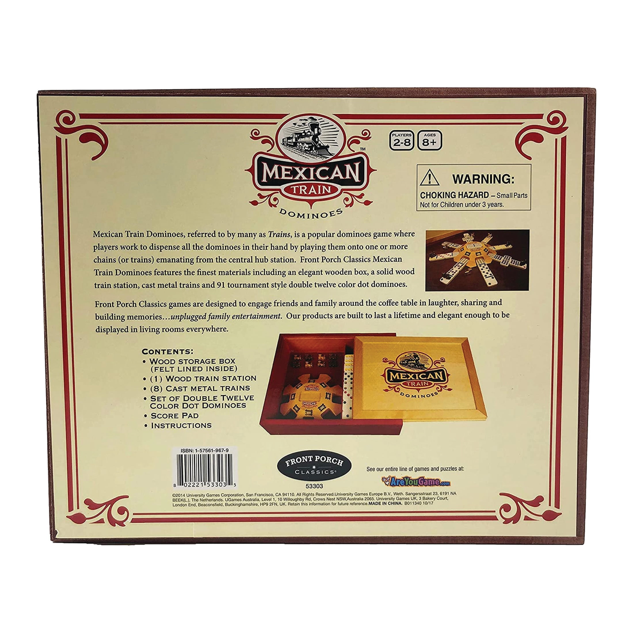 Front Porch Classics Wood Box Mexican Train Dominoes is a premium version of the popular domino game, beautifully presented in a sturdy wooden box. This set is designed for both beginners and seasoned players, offering a fun and engaging way to enjoy family gatherings or game nights. Front Porch Classics Mexican Train Dominoes features the finest materials including an elegant wooden box, a solid wood train station, cast metal trains and 91 tournament style double twelve color dot dominoes.