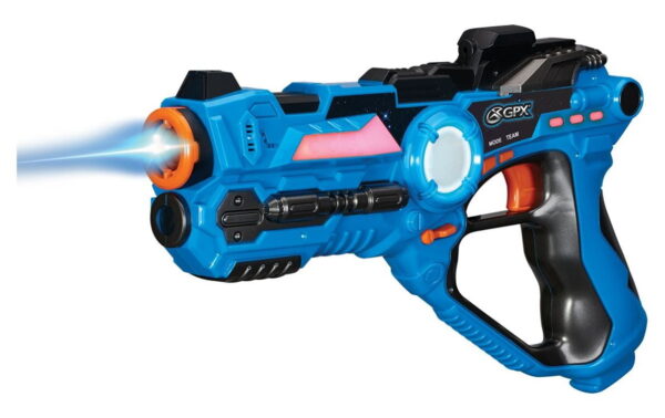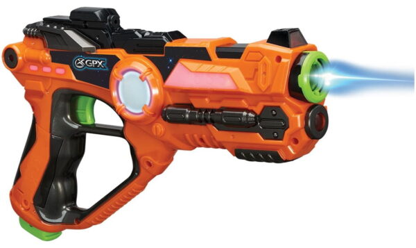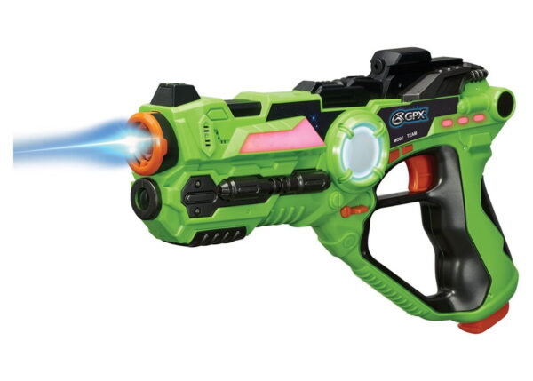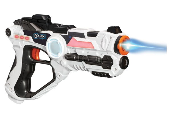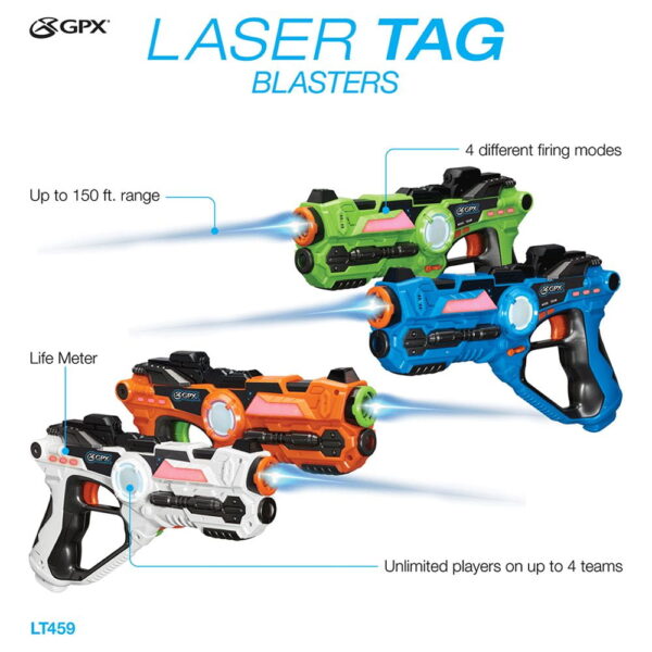 With GPX’s 4-Blaster laser tag set you can organize a game of laser tag with four friends and enjoy hours of fun. These blasters, in white, blue, green and orange, light up and vibrate with each tag and have an array of sounds for added excitement. Every game you play can feature up to four teams with an infinite number of players on each (must purchase additional sets for player counts beyond 4). Additionally, every blaster features nine lives per game, four tagging modes, a team selector button, volume control, reload button and an on/off switch. The built in IR receiver/transmitter allows you and your teammates to battle from over 130 feet away. Let the battle begin! See review of our GPX Laser Tag Blasters here: https://youtu.be/SyqQplSQKLM