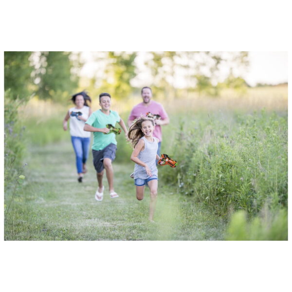 4 laser tag blasters Built-in IR LED blaster and hit receiver sensor 4 modes: single shot, laser beam, rapid fire, rocket 9-part life gauge indicators 4 color team indicator lights Team selector switch Play with up to 4 teams Reload/volume button On/off switch Laser shot range: up to 180 ft. DC battery power: requires 3 AA batteries for each blaster (not included) Works with LT159 and LT259 laser tag blasters and LTV19 laser tag vest Suggested age: 8+ Includes 4 different color blasters 30-day limited warranty User’s guide