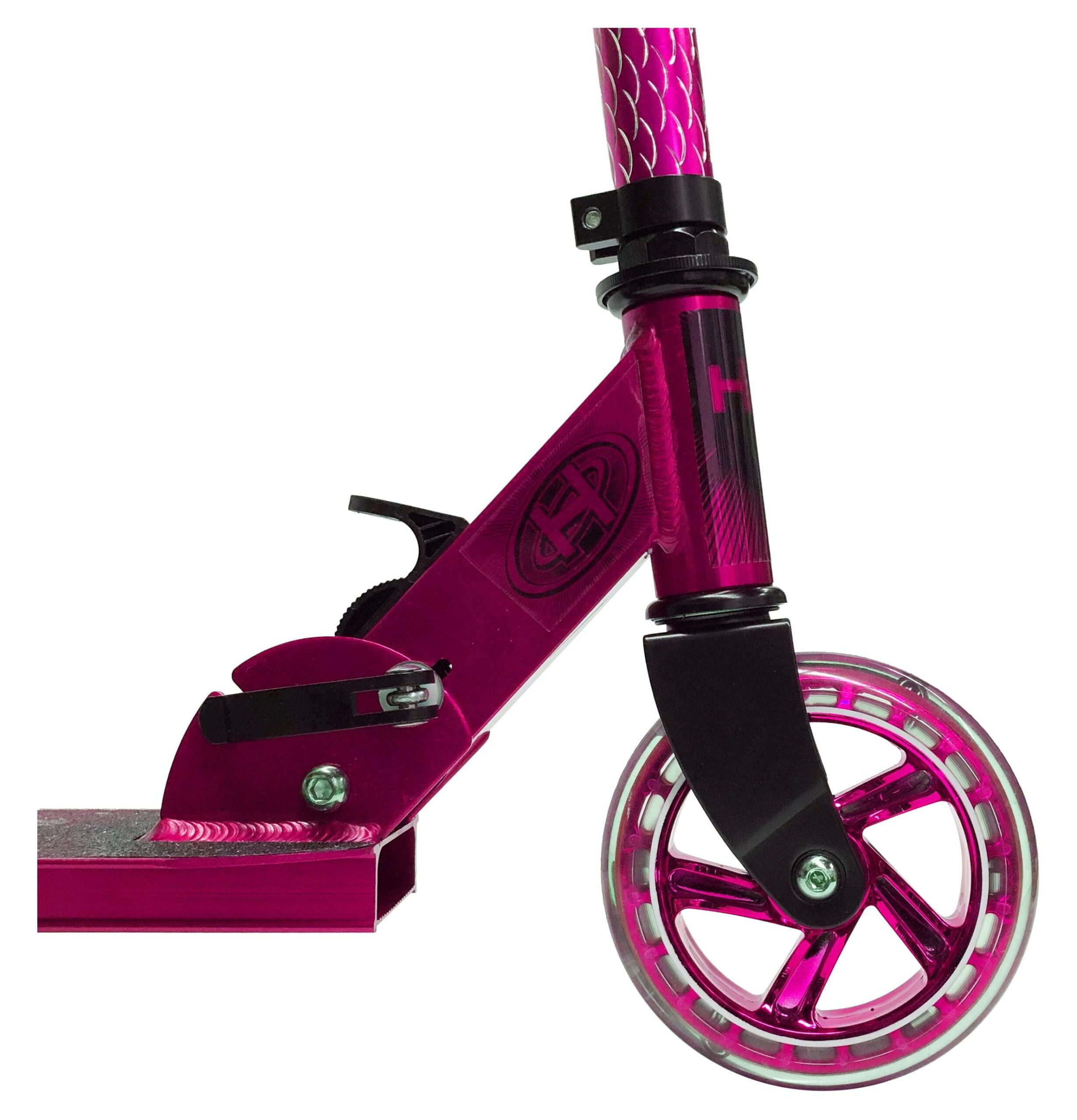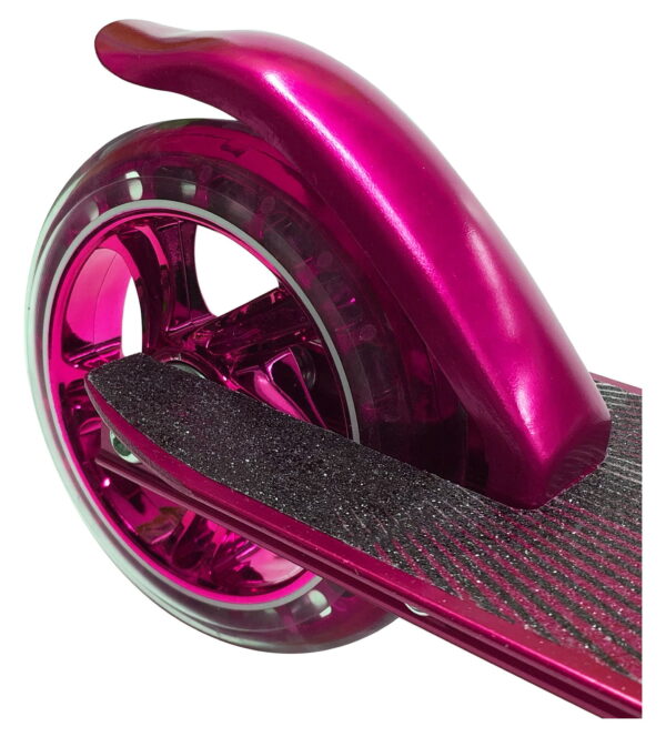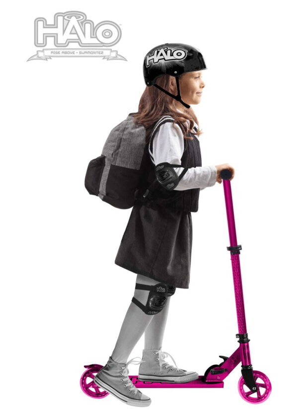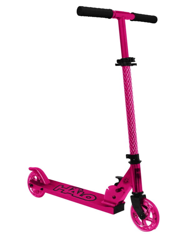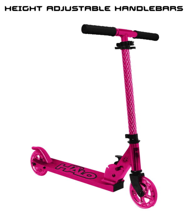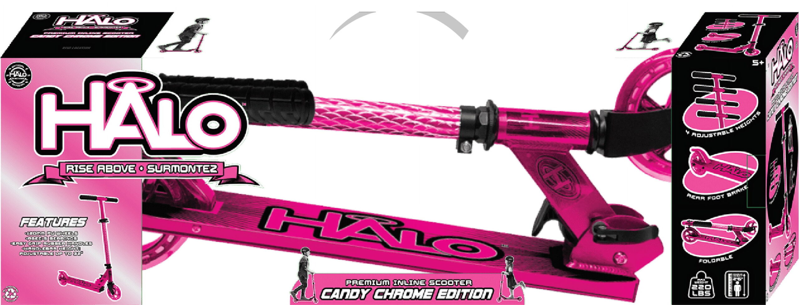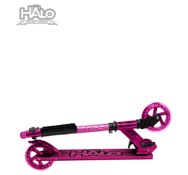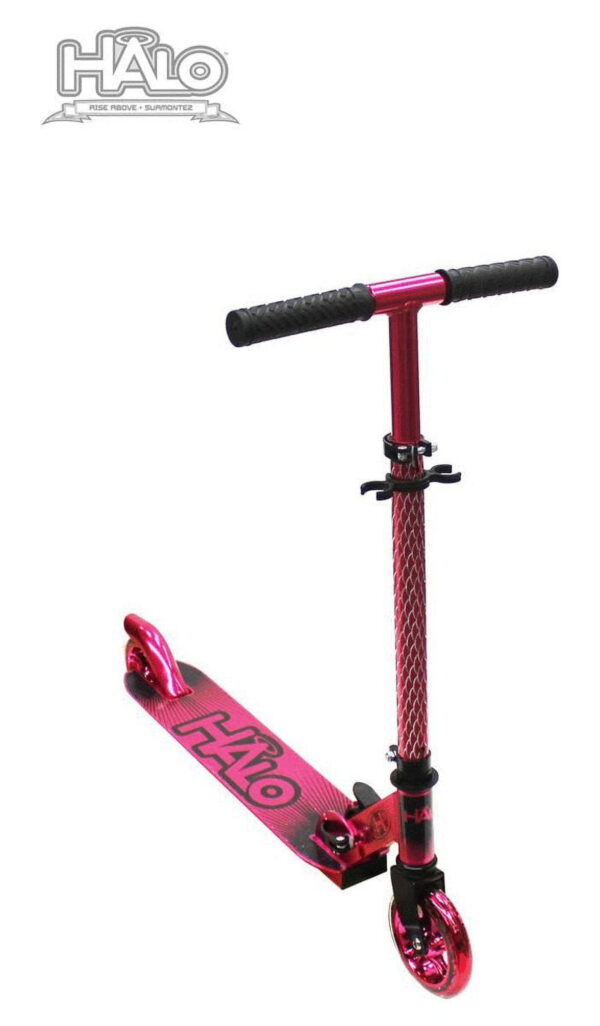 HALO Rise Above Candy Chrome Premium Inline Scooter – Chrome Pink. Chrome Aluminum Lightweight Deck with engraved front tube and 120mm Urethane Long Lasting Wheels with ABEC-5 high precision bearings Height Adjustable rubber grip handle bars can be customized to 4 different heights for all different size riders! Equipped with a folding frame that makes carrying or storing the scooter extra easy! A custom, diamond engraved front tube adds a unique premium style to the Candy Chrome Scooter! Designed for all riders ( unisex ) up to a max weight of 220 pounds with a smooth ride. A true combination of safety and style with a premium look and feel. HALO Rise Above Candy Chrome Scooters bring a superior ride and style to any rider, boys and girls, a perfect gift for holidays, birthdays and Christmas! Whether you are looking for a chrome scooter, blue scooter, boy scooter, girls scooter or a scooter for a young child or toddler who is ready for a 2 wheel scooter, the Candy Chrome fits the description. The height adjustable handle allows riders or all ages to customize their handle bars!